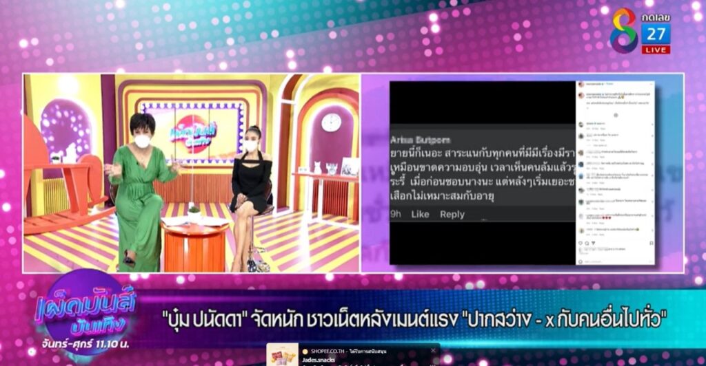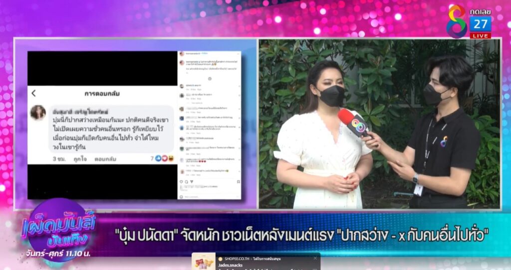 ก็แล้วแต่เลยนะ แต่อยากให้เค้ารู้ว่า ก่อนที่จะเม้นอะไร คิดก่อน แล้วรวมถึงคนที่กดไลด์ด้วย สนับสนุนอ่ะ พวกสนับสนุนทั้งหลายค่ะ แล้วที่ตกใจก็คือส่วนมากเป็นผู้หญิง คุณงงมั้ยกับความคิดของเค้า ผู้หญิงดูถูกผู้หญิงด้วยกัน โดยที่คุณไม่ได้รู้จักตัวตนกันเลย บุ๋มว่าบุ๋มเป็นคนนึงที่ยินดี ยินดีที่จะตอบตรงๆ ไปตรงมาทุกครั้งที่นักข่าวถาม แต่บางทีการที่นักข่าวถาม บางคนก็บอกว่าบุ๋มออกมาแฉ ขอโทษนะคะถ้าบุ๋มจะแฉ บุ๋มเขียนเล่าในไอจีบุ๋มได้ ไม่ต้องรอนักข่าวออกมาสัมภาษณ์หรอก แต่บุ๋มเป็นคนจริงใจ และเชื่อว่าความลับมันไม่มีในโลก ดังนั้นเมื่อนักข่าวถามว่า รู้เรื่องที่มั้ย บุ๋มก็ต้องตอบว่ารู้ ก็รู้เพราะว่าเค้าเอามาขาย ก็พูดตรงๆ แล้วทำไมไม่ซื้อ ก็เพราะว่ามันเป็น สบก บุ๋มก็เล่าแค่นี้ แต่เรื่องธุรกิจสีเทา บุ๋มเล่าตามข่าวว่า พี่ติ๋มพูดอะไร อ่านข่าวค่ะ ไม่ใช่ว่าดิฉันพูด เพราะว่าเรื่องแบบนี้ไม่ได้ไปสนิทขนาดนั้นค่ะ