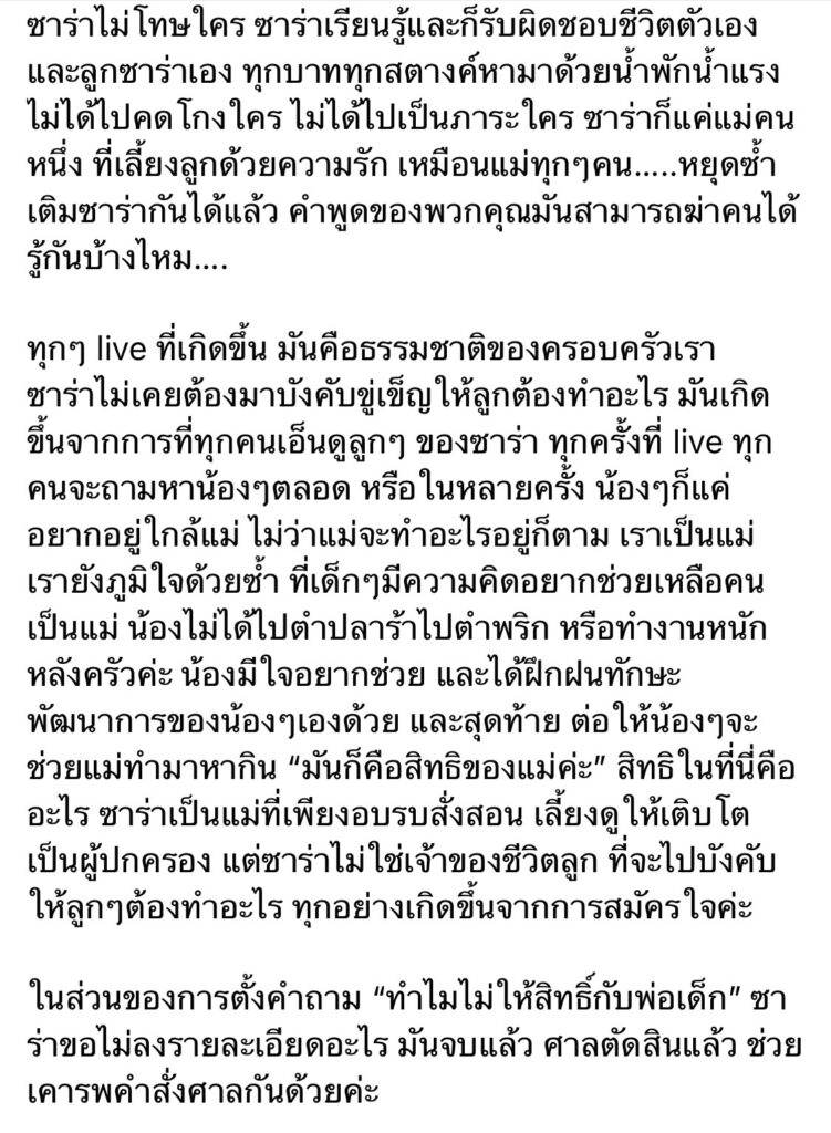 นอกจากนี้ “ซาร่า” ยังเผยอีกว่า ทุกๆไลฟ์ ที่เกิดขึ้น คือธรรมชาติของครอบครัว ตนไม่เคบยังคับขู่เข็ญให้ลูกต้องทำอะไร บางครั้งคนถามหาลูก หรือบางครั้งลูกก็แค่อยากอยู่ใกล้แม่ และสุดท้าย ต่อให้ลูกๆจะช่วยแม่ทำมาหากิน มันก็คือสิทธิของแม่ค่ะ แต่ในส่วนของการตั้งคำถาม “ทำไมไม่ให้สิทธิ์กับพ่อเด็ก” ตนขอไม่ลงรายละเอียดอะไร เพราะเรื่องจบแล้ว ศาลได้ตัดสินแล้ว อยากให้ช่วยเคารพคำสั่งศาลกันด้วย