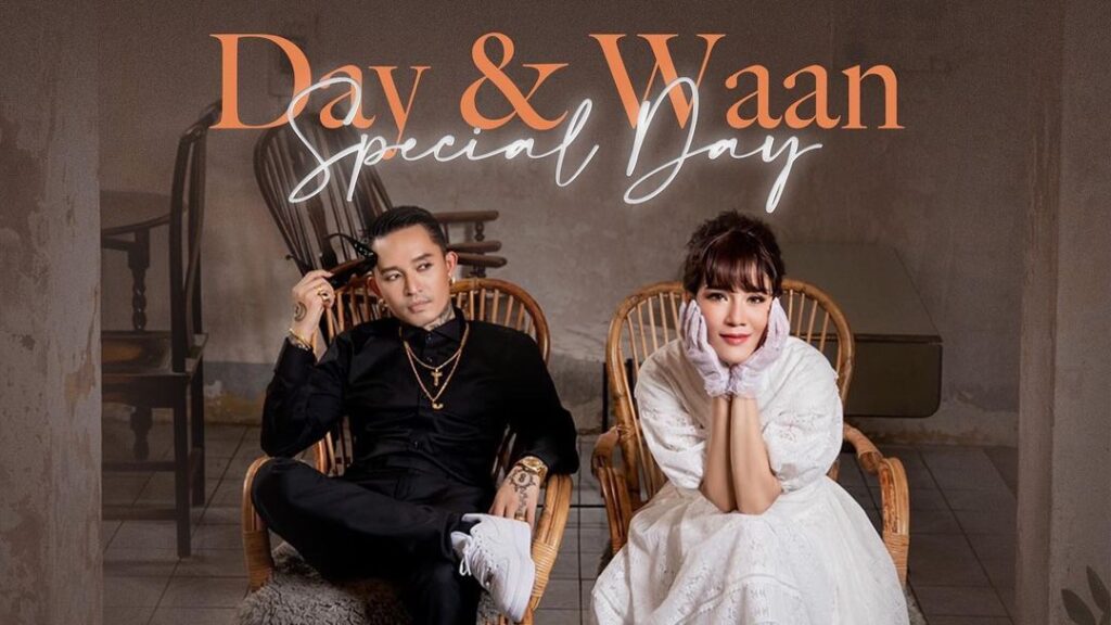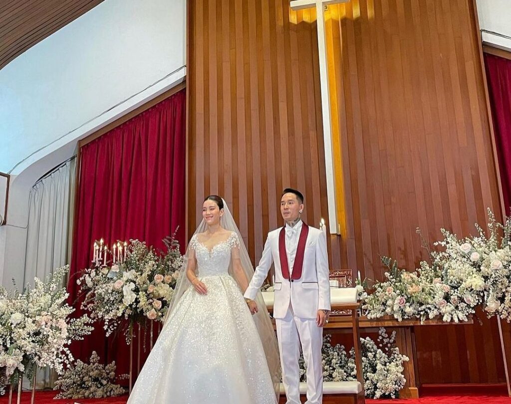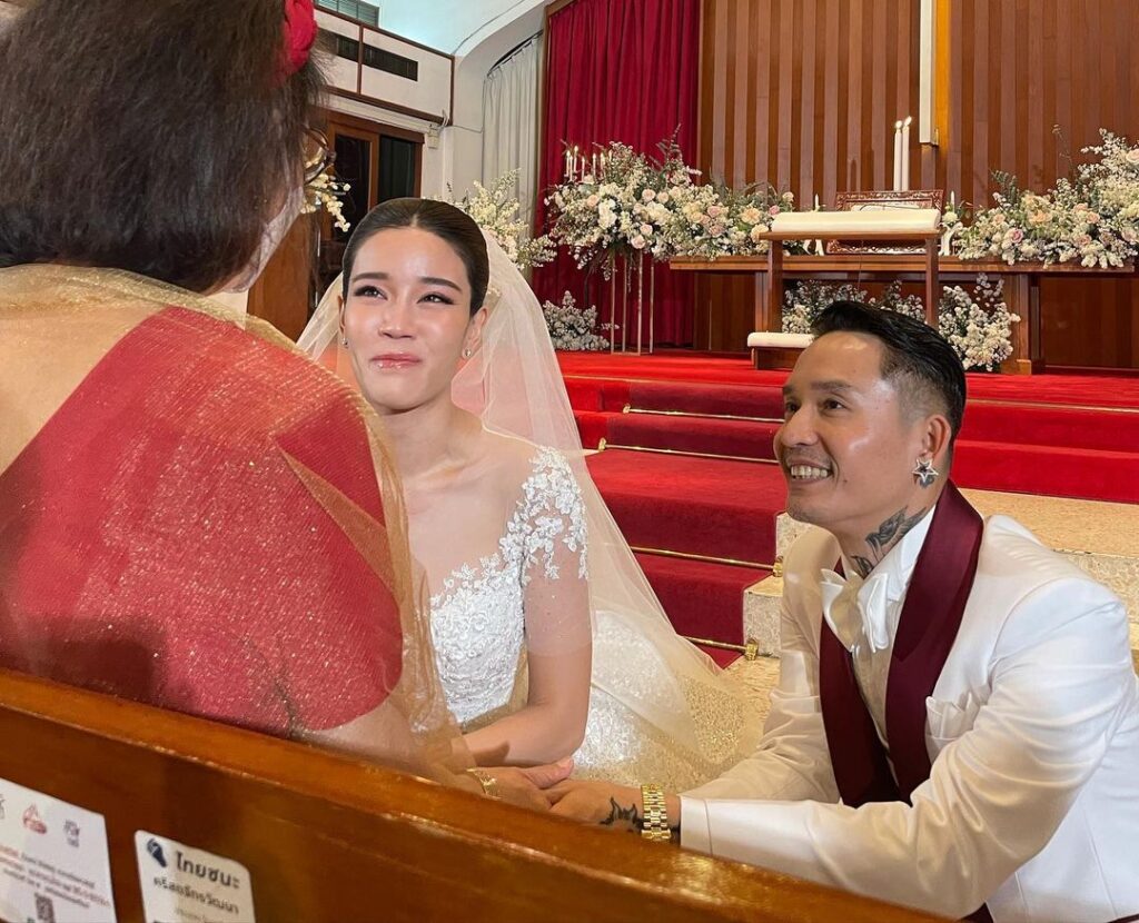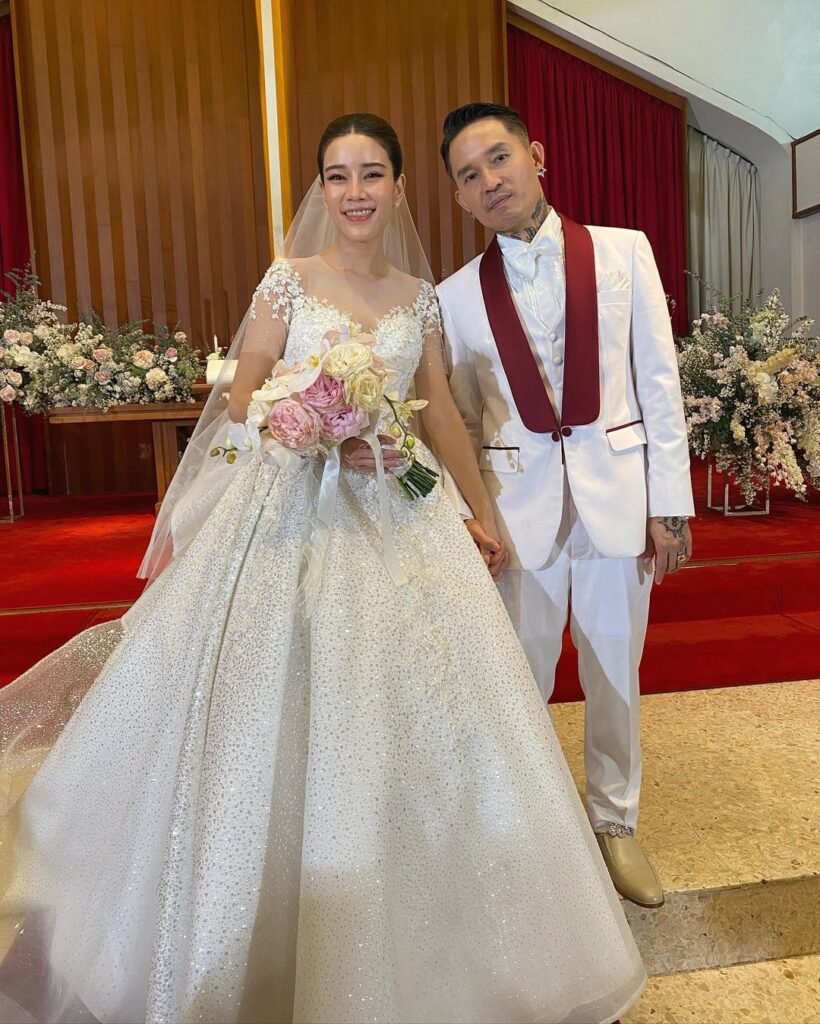 ซึ่งหนุ่ม “เดย์ ไทเทเนี่ยม” เจ้าบ่าวมาในชุดสูทสีขาวหล่อ ดูดี เข้ากับเจ้าสาวคนสวย “น้ำหวาน เขมจิรา” ที่สวมชุดเดรสสีขาวเปล่าออร่าความสวยขั้นสุด
