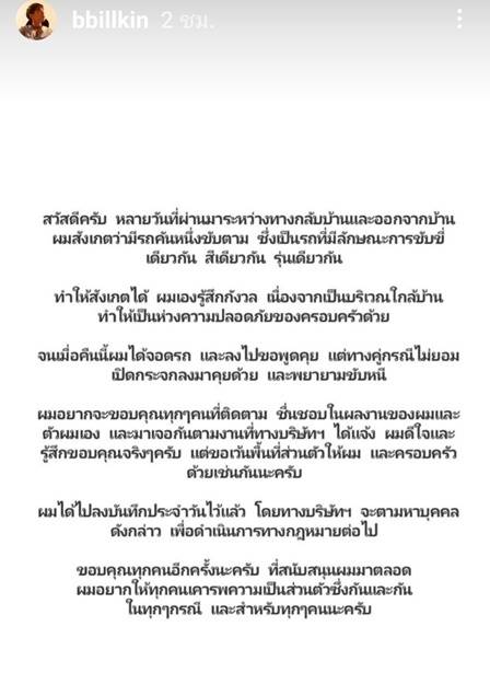 ผมอยากจะขอบคุณทุกๆ คนที่ติดตาม ชื่นชอบในผลงานของผมและตัวผมเอง และมาเจอกันตามงานที่ทางบริษัทฯ ได้แจ้ง ผมดีใจและรู้สึกขอบคุณจริงๆ ครับ แต่ขอเว้นพื้นที่ส่วนตัวให้ผมและครอบครัวด้วยเช่นกันนะครับ ผมได้ไปลงบันทึกประจำวันไว้แล้ว โดยทางบริษัทฯ จะตามหาบุคคลดังกล่าว เพื่อดำเนินการทางกฎหมายต่อไป ขอบคุณทุกคนอีกครั้งนะครับ ที่สนับสนุนผมมาตลอด ผมอยากให้ทุกคนเคารพความเป็นส่วนตัวซึ่งกันและกันในทุกๆ กรณี และสำหรับทุกๆ คนนะครับ”