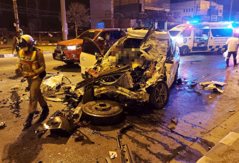 หนุ่มใหญ่ซิ่งเก๋งอัดท้าย6ล้อจอดติดไฟแดงดับ