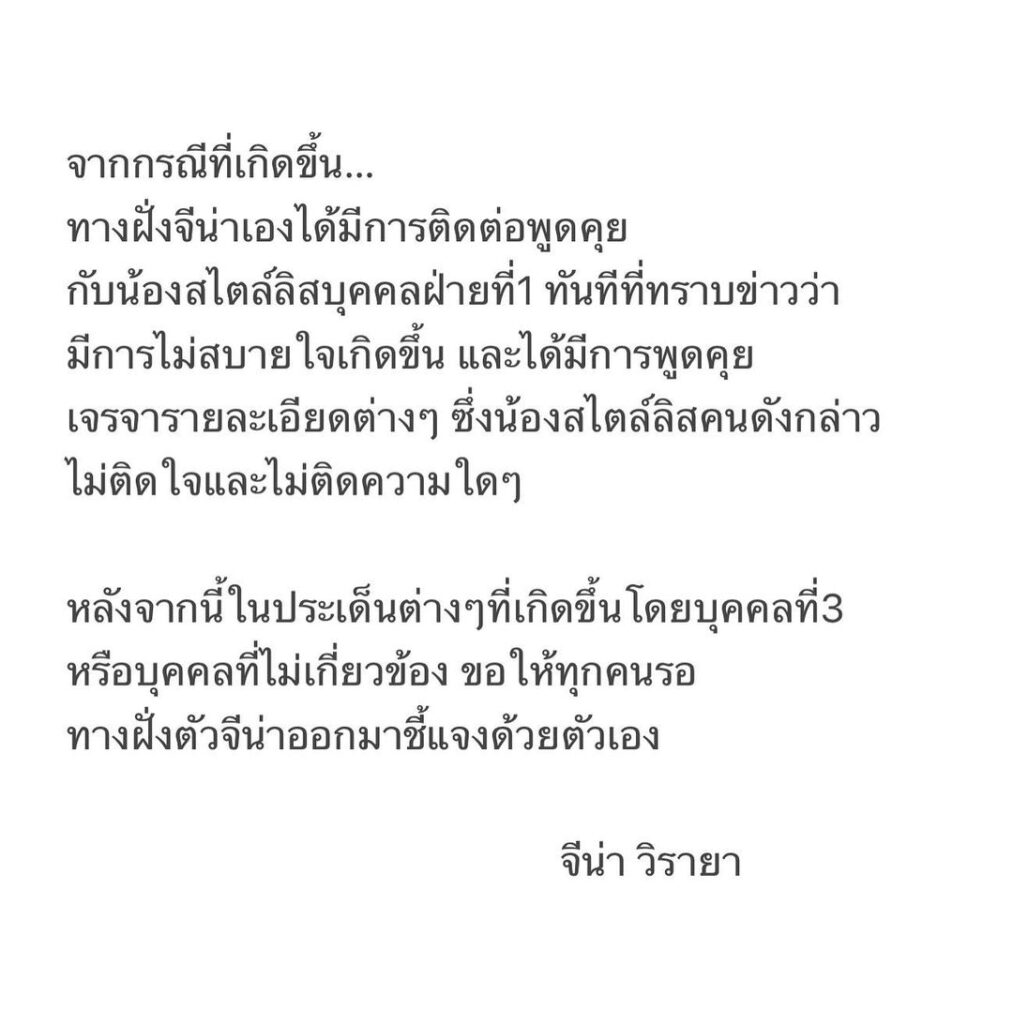 โดย “จีน่า” ได้บอกว่า “จากกรณีที่เกิดขึ้น ทางฝั่งจีน่าเองได้มีการติดต่อพูดคุยกับน้องสไตลิสต์ บุคคลฝ่ายที่ 1 ทันทีที่ทราบข่าวว่ามีการไม่สบายใจเกิดขึ้น และได้มีการพูดคุยเจรจารายละเอียดต่างๆ ซึ่งน้องสไตลิสต์คนดังกล่าวไม่ติดใจ และไม่ติดความใดๆ