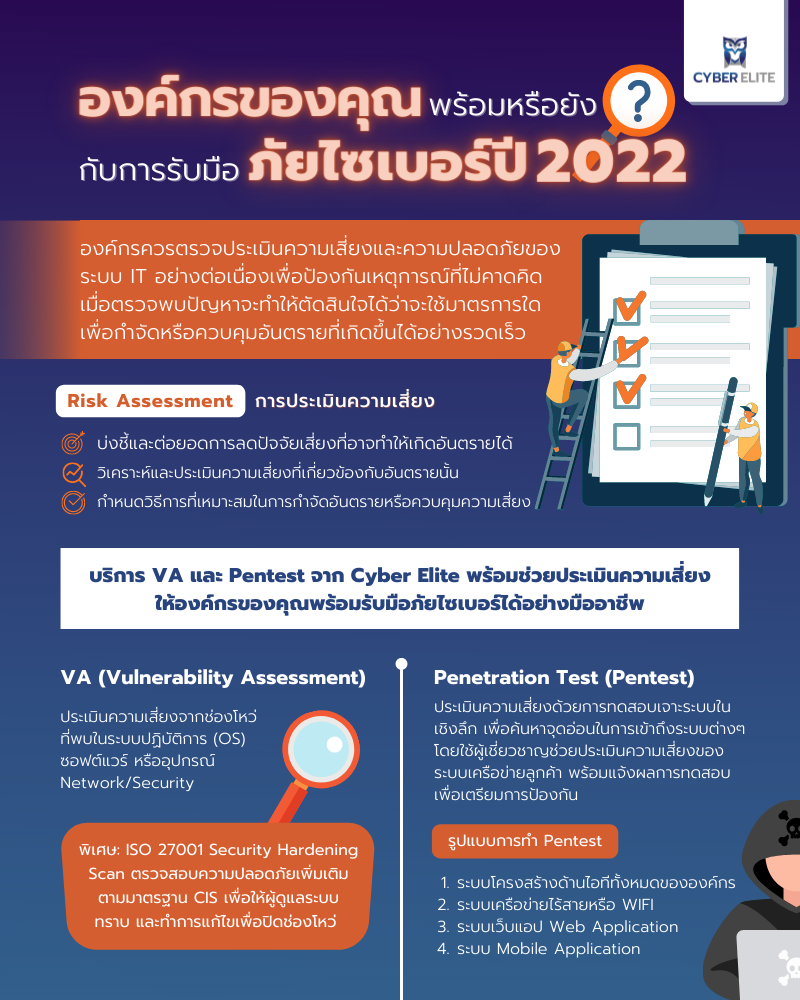 โดยบริการ VA (Vulnerability Assessment) และ Penetration Test ถือเป็นที่ยอมรับในกระบวนการของการประเมินความเสี่ยง โดยบริการที่ทางเรา ไซเบอร์ อีลีท อยากแนะนำ มีจุดเด่นหลักๆดังนี้