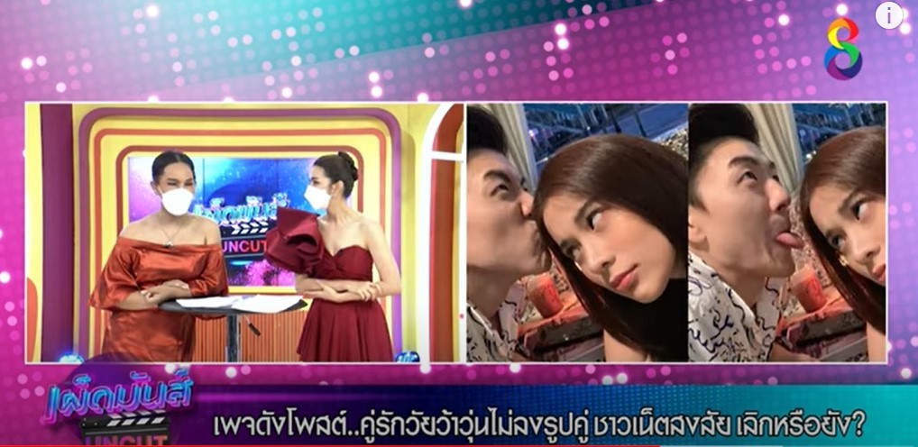 เฉลยแล้วที่แรก !! ในรายการ “เผ็ดมันส์บันเทิง” ช่อง 8 หลังเพจดัง “เจ๊มอย 108” ได้โพสต์ว่า “มีคู่รักวัยว้าวุ่น กับแฟนตี๋ไม่ลงรูปคู่กันเลย วาเลนไทน์ก็เงียบกริบ ไร้วี่แวว และใช่ค่ะ.. อิติ่ง อิแฟนคลับหลายคน ก็แชทมาถามกู..เค้าเลิกกันยัง? โอ๊ย!! พวกเมิงจำกันไม่ได้เหรอ? การไม่ลงรูปคู่ ไม่ได้การันตีว่ารักเมิงพัง อีผี!!เอ๊ะ!! หรือยังไง กูลุ้นหวยอยู่ หัวหน้าห้องมาสืบที”