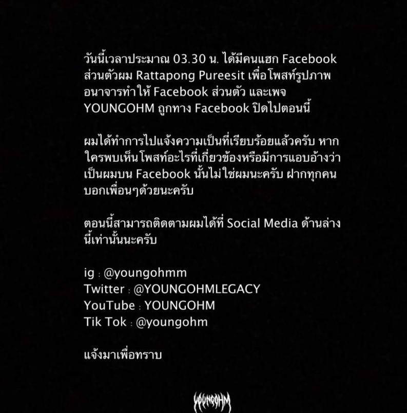 ฝากทุกคนบอกเพื่อนๆด้วยนะครับตอนนี้สามารถติดตามผมได้ที่ Social Media ด้านล่างนี้เท่านั้นนะครับ ig : @youngohmm Twitter : @YOUNGOHMLEGACY YouTube : YOUNGOHM Tik Tok : @youngohm แจ้งมาเพื่อทราบ”