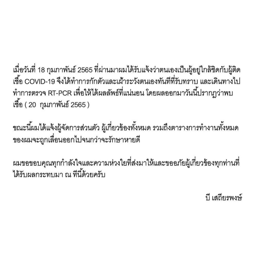 “เมื่อวันที่ 18 กุมภาพันธ์ 2565 ที่ผ่านมา ผมได้รับแจ้งว่าตนเองเป็นผู้อยู่ใกล้ชิดผู้ติดเชื้อโควิด COVID-19 จึงได้ทำการกักตัวและเฝ้าระวังตนเองทันทีที่รับทราบ และ เดินทางไปทำการตรวจ RT-PCR เพื่อให้ได้ผลลัพธ์ที่แน่นอน โดยผลออกมาวันนี้ปรากฎว่าพบเชื้อ (20 กุมภาพันธ์ 2565)