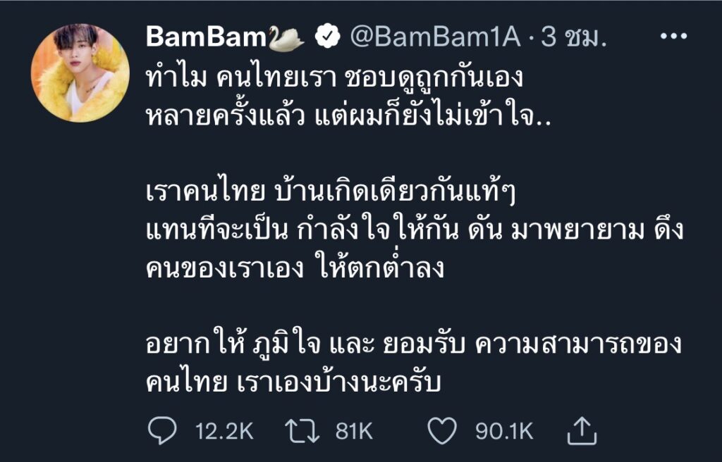 ซึ่งงานนี้แฟนคลับทั้งชาวไทยและต่างประเทศต่างเข้ามาคอมเมนต์ส่งกำลังใจให้และแสดงความเป็นห่วงเป็นใยหนุ่ม “แบมแบม” กันอย่างล้นหลามเลยทีเดียว