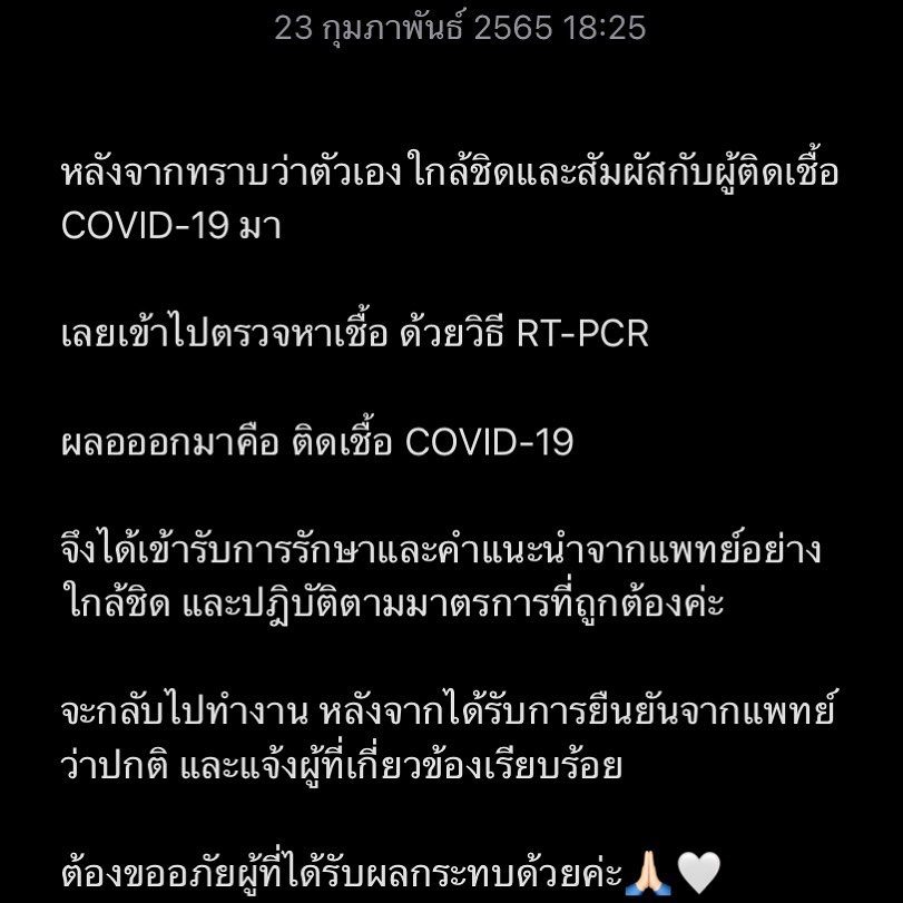 จึงได้เข้ารับการรักษาและคำแนะนำจากแพทย์อย่างใกล้ชิด และปฏิบัติตามมาตรการที่ถูกต้องค่ะ จะกลับไปทำงาน หลังจากได้รับการยืนยันจากแพทย์ว่าปกติ และแจ้งผู้ที่เกี่ยวข้องเรียบร้อย ต้องขออภัยผู้ที่ได้รับผลกระทบด้วยค่ะ”