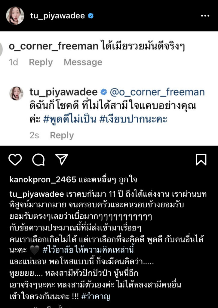 ทำเอาของขึ้นเลยทีเดียว สำหรับผู้จัดคนสวยอย่างตู่ ปิยวดีที่ล่าสุดมีชาวเน็ตรายหนึ่งเข้ามาคอมเมนต์แซะหนุ่มมาวินว่า  ได้เมียรวยมันดีจริงๆงานนี้ตู่ ปิยวดีก็ไม่ขอปล่อยผ่านแท็กตรงถึงอีกฝ่ายสวนกลับนิ่มๆแต่แสบไปถึงทรวงว่าดิฉันก็โชคดีที่ไม่ได้สามีใจแคบอย่างคุณค่ะ #พูดดีไม่เป็น  #เงียบปากนะคะ”