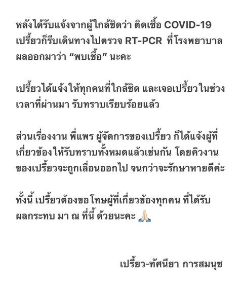 ส่วนเรื่องงาน พี่แพร ผู้จัดการของเปรี้ยว ก็ได้แจ้งผู้ที่เกี่ยวข้องให้รับทราบทั้งหมดแล้วเช่นกัน โดยคิวงานของเปรี้ยวจะถูกเลื่อนออกไป จนกว่าจะรักษาหายดีค่ะ