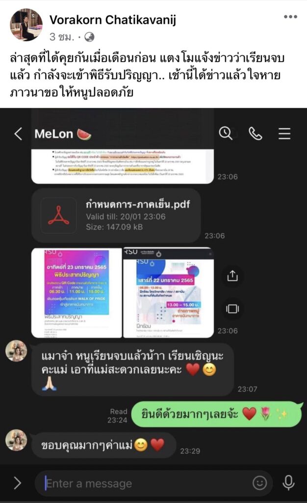 ทางด้าน “วรกร จาติกวณิช” ภรรยา “กรณ์ จาติกวณิช” และเป็นคุณแม่ของหนุ่ม “แต๊งค์ พงศกร” อดีตคนรัก แตงโม ก็ได้โพสต์แชทล่าสุดที่ได้พูดคุยกับแตงโม เมื่อเดือนก่อนหลังจากที่อีกฝ่ายส่งข้อความบอกข่าวดีเรียนจบแล้วและเรียนเชิญให้ไปร่วมงานรับปริญญา ซึ่งทางคุณแม่ของแต๊งค์ ก็ได้แสดงความยินดีตอบกลับไปเช่นกัน
