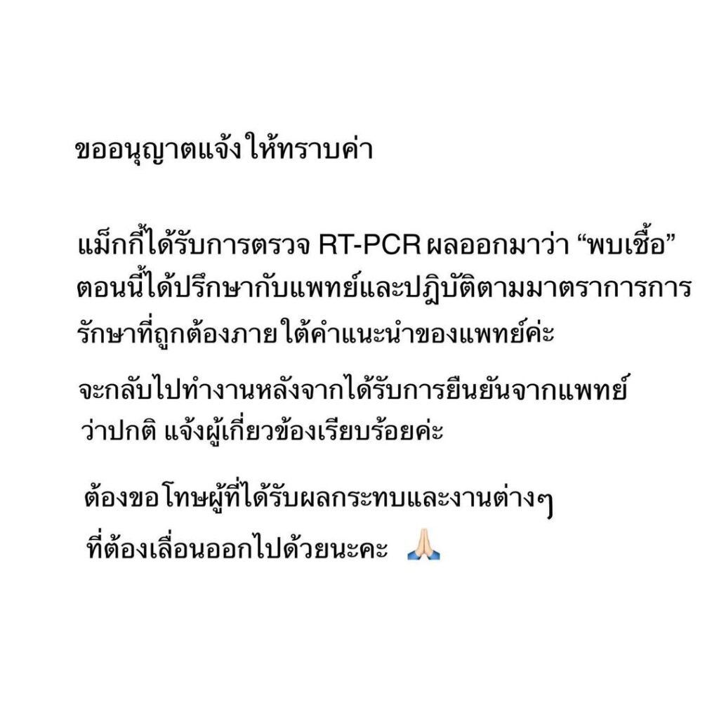 โดยเจ้าตัวได้ระบุว่า “ขออนุญาตแจ้งให้ทราบค่า แม็กกี้ได้รับการตรวจ RT-PCR ผลออกมาว่า “พบเชื้อ” ตอนนี้ได้ปรึกษากับแพทย์และปฏิบัติตามมาตรการการรักษาที่ถูกต้องภายใต้คำแนะนำของแพทย์ค่ะ