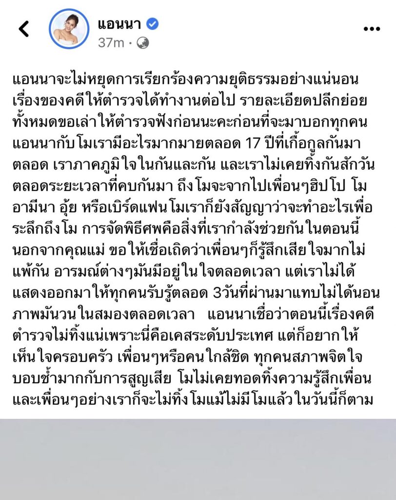 ขอให้เชื่อเถิดว่าเพื่อนๆก็รู้สึกเสียใจมากไม่แพ้กัน อารมณ์ต่างๆมันมีอยู่ในใจตลอดเวลา แต่เราไม่ได้แสดงออกมาให้ทุกคนรับรู้ตลอด 3วันที่ผ่านมาแทบไม่ได้นอน ภาพมันวนในสมองตลอดเวลา แอนนาเชื่อว่าตอนนี้เรื่องคดีตำรวจไม่ทิ้งแน่เพราะนี่คือเคสระดับประเทศ แต่ก็อยากให้เห็นใจครอบครัว เพื่อนๆหรือคนใกล้ชิด ทุกคนสภาพจิตใจบอบช้ำมากกับการสูญเสีย โมไม่เคยทอดทิ้งความรู้สึกเพื่อน และเพื่อนๆอย่างเราก็จะไม่ทิ้งโมแม้ไม่มีโมแล้วในวันนี้ก็ตาม”