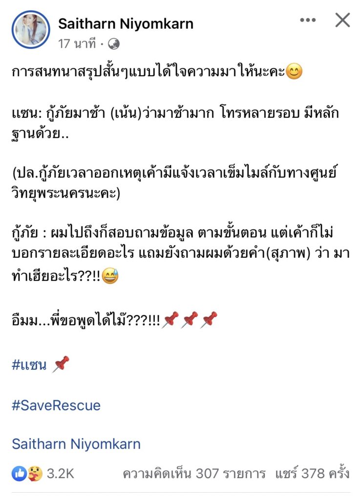 จากนั้น “ต่าย สายธาร นิยมกาญจน์” ออกมาฟาดว่าแก๊งเพื่อนต่างหากที่เป็นฝ่ายไม่ให้ข้อมูล และรีบหายตัวไป แถมด่ากลับทีมกู้ภัยอีกว่า มาทำเฮียอะไร?