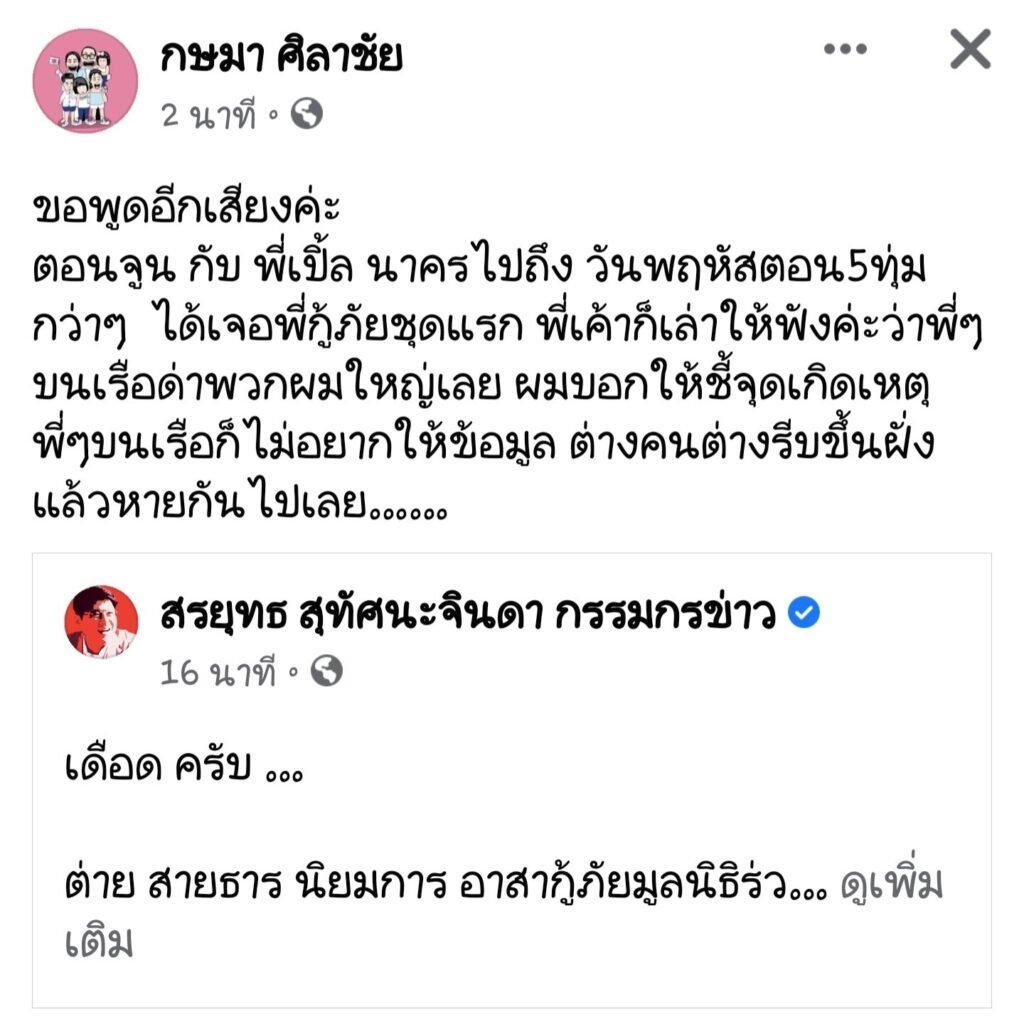 ด้าน “จูน กษมา” ภรรยา “เปิ้ล นาคร ศิลาชัย” ก็ได้ออกมาโพสต์ยืนยันอีกเสียงว่า ทีมกู้ภัยที่มาถึงถูกด่าจริงว่า “ขอพูดอีกเสียงค่ะ ตอนจูน กับ พี่เปิ้ล นาครไปถึง วันพฤหัสตอน5ทุ่มกว่าๆ ได้เจอพี่กู้ภัยชุดแรก พี่เค้าก็เล่าให้ฟังค่ะว่าพี่ๆบนเรือด่าพวกผมใหญ่เลย ผมบอกให้ชี้จุดเกิดเหตุ พี่ๆบนเรือก็ไม่อยากให้ข้อมูล ต่างคนต่างรีบขึ้นฝั่งแล้วหายกันไปเลย……”