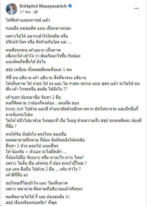 โดยระบุว่า “ได้ฟังคำแถลงการณ์ แล้ว ก่อนอื่น ผมขอคิด แบบ เป็นกลางก่อน เพราะไม่ได้ อยากเข้าใจใครผิด หรือ ปรักปรำใคร หรือ คิดร้ายกับใคร เเต่…คนฟังทุกคน เขาอยาก เห็นภาพ เพื่อจะได้ เข้าใจ ว่า มันเกิดอะไรขึ้น กับน้อง และมันเกิดขึ้นได้ยังไง