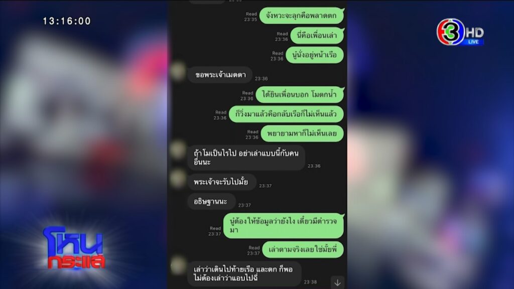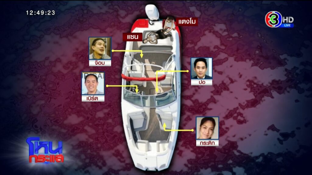 ปอ : ณ เหตุการณ์ตอนนั้น ถามว่าเรากลับเพราะอะไร เราหาตั้งแต่สี่ทุ่มกว่าๆ จนเหตุการณ์ที่เราเริ่มกลับคือตี 1 ตอนนั้นผมมีทีมของผมที่เอ็นบีซี และบีมศรัณยูช่วยกันหา เราก็หาเผื่อมีการลอยมาที่เอ็นบีซี แมสเสจที่คุยกับกระติก เขาบอกว่าของๆ โมอยู่กับติก มือถือโมอยู่กับติก ถ้าปาฏิหาริย์เกิดขึ้นคือโมรอด เชื่อว่าที่เดียวที่โมจะติดต่อติกคืออยู่ที่บ้าน ฉะนั้นติกขอกลับบ้านเผื่อไปเจอโม ระหว่างนั้นเริ่มมีข่าวออกมาเยอะมาก มาถึงตอนเช้าพวกเราไมได้นอน เราคุยกันว่าเราทำแบบนี้ เราไปช่วยกันหาโม สิ่งที่ผมทำได้คือน้องผมชื่อแชมป์ เอาเรือออก ทีมงานแชมป์ที่มีเจ็ตสกีสามารถลงได้ เราลงเต็มที่ เราเตรียมข้อมูลว่าจะเอาเรื่องจริงทั้งหมดมาให้กับทางตร. เช้าวันนั้นก็ให้พี่ชื่อเอ็ม ติดต่อผู้กำกับว่าเราจะเข้ามาให้ปากคำ กลุ่มนึงลงพื้นที่พร้อมทีมงาน ตอนนั้นไม่ใช่เรื่องง่าย เพราะท่าเรือที่เราเอาเรือลงได้เลยคือปิด แต่เราทำเต็มที่ เราไม่ได้หยุดที่จะกลับบ้าน เราลงพื้นที่ อีกส่วนนึงเราช็อกมาก ถามผมวันนี้หลับตาผมยังนอนไม่หลับ ยังเห็นหน้าโมอยู่ตลอด เป็นเรื่องที่ผมเชื่อมั่นว่าถ้าใครไม่เจอเหตุการณ์แบบนี้ในชีวิต คุณไม่มีทางเข้าใจ