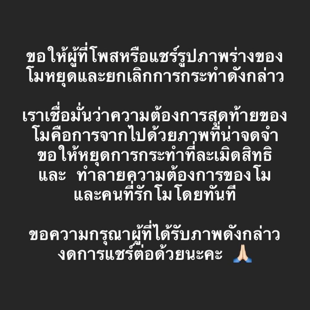 ล่าสุด “กระติก” ได้เคลื่อนไหวในอินสตาแกรม ด้วยการโพสต์ข้อความถึงแตงโมครั้งแรก วอนหยุดโพสต์หรือแชร์ภาพร่างของ “แตงโม” โดยมีข้อความระบุว่า “ขอให้ผู้ที่โพสต์หรือแชร์รูปภาพร่างของแตงโมหยุดและยกเลิกการกระทำดังกล่าว เราเชื่อมั่นว่าว่าความต้องการสุดท้ายของโมคือการจากไปด้วยภาพที่น่าจดจำ ขอให้หยุดการกระทำที่ละเมิดสิทธิและ ทำลายความต้องการของโมและคนที่รักโมโดยทันที ขอความกรุณาผู้ที่ได้รับภาพดังกล่าวงดการแชร์ต่อด้วยนะคะ”