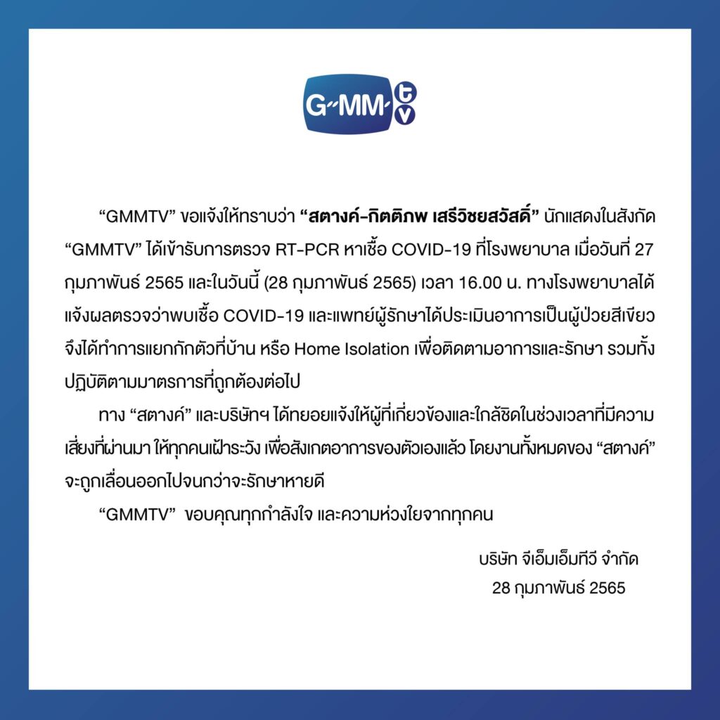 ส่วนทางด้านนักแสดงหนุ่ม “สตางค์ กิตติภพ” “GMMTV” ได้แจ้งว่า เข้ารับการตรวจ RT-PCR หาเชื้อ COVID-19 ที่โรงพยาบาลเมื่อวันที่ 27 กุมภาพันธ์ และในวันนี้ (28 กุมภาพันธ์ 2565) เวลา 16.00 น.ทางโรงพยาบาลได้แจ้งผลตรวจว่าพบเชื้อ COVID-19 และแพทย์ผู้รักษาได้ประเมินอาการเป็นผู้ป่วยสีเขียว จึงได้ทำการแยกกักตัวที่บ้าน หรือ Isolation เพื่อติดตามอาการและรักษา รวมทั้งปฏิบัติตามมาตรการที่ถูกต้องต่อไป