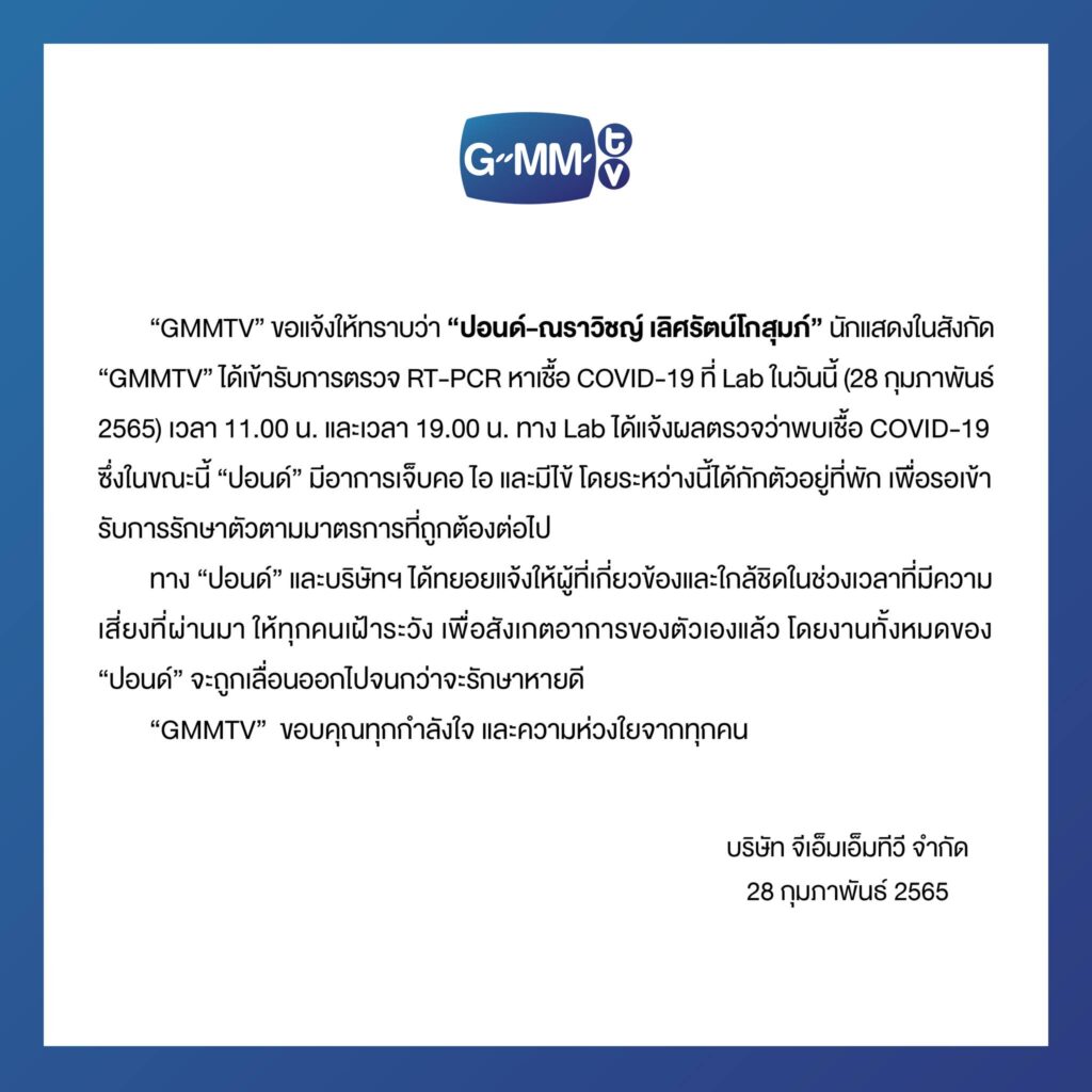 “GMMTV” ขอแจ้งให้ทราบว่า “ปอนด์ ณราวิญ์ เลิศรัตน์โกสุมภ์” นักแสดงในสังกัด ได้เข้ารับการตรวจ RT-PCR หาเชื้อ COVID-19 ที่ Lab ในวันนี้ (28 กุมภาพันธ์ 2565) เวลา 11.00 น. และเวลา 19.00 น. ทาง Lab ได้แจ้งผลตรวจว่าพบเชื้อ COVID-19 ซึ่งในขณะนี้ “ปอนด์” มีอาการเจ็บคอ ไอ และมีไข้ โดยระหว่างนี้ได้กักตัวอยู่ที่พัก เพื่อรอเข้ารับการรักษาตัวตามมาตรการที่ถูกต้องต่อไป