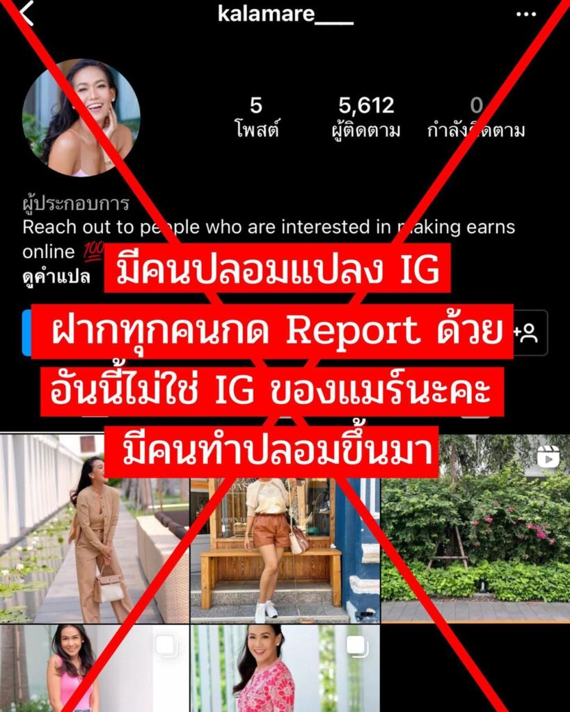 ซึ่ง “กาละแมร์” ได้แคปไอจีปลอมดังกล่าวดพสต์ลงอินสตาแกรมส่วนตัวพร้อมกับบอกว่า “มีคนปลอมแปลง IG ฝากทุกคนกด Report ด้วย อันนี้ไม่ใช่ IG ของแมร์นะคะ มีคนทำปลอมขึ้นมา @kalamare___”