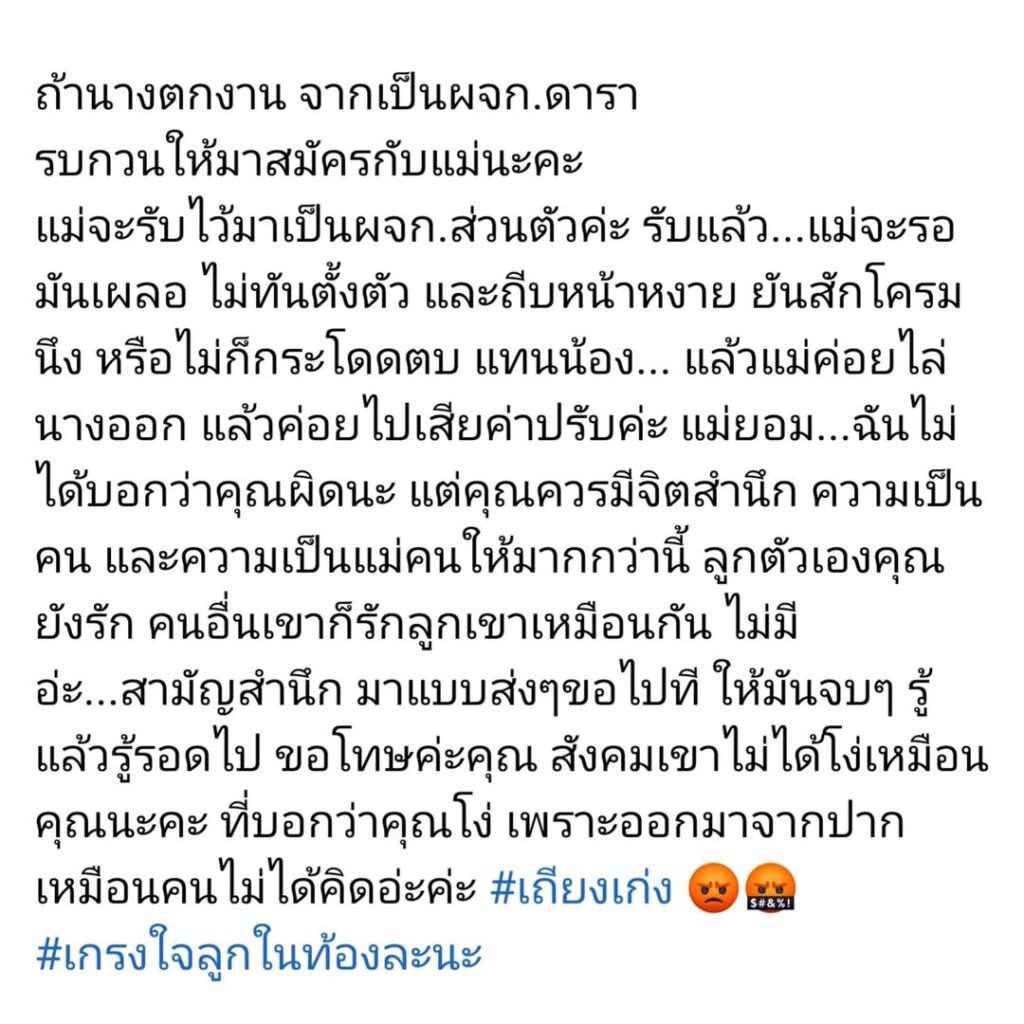 “ถ้านางตกงาน จากเป็น ผจก.ดารา รบกวนให้มาสมัครกับแม่นะคะ แม่จะรับไว้มาเป็น ผจก.ส่วนตัวค่ะ รับแล้ว…แม่จะรอ มันเผลอ ไม่ทันตั้งตัว และถีบหน้าหงาย ยันสักโครมนึง หรือไม่ก็กระโดดตบ แทนน้อง..นางออก แล้วค่อยไปเสียค่าปรับค่ะแม่ยอม…ฉันไม่ได้บอกว่าคุณผิดนะ แต่คุณควรมีจิตสำนึก ความเป็นคน และความเป็นแม่คนให้มากกว่านี้ ลูกตัวเองคุณยังรัก คนอื่นเขาก็รักลูกเขาเหมือนกัน ไม่มี…สามัญสำนึก มาแบบส่งๆขอไปที ให้มันจบๆ รู้ แล้วรู้รอดไป ขอโทษค่ะคุณ สังคมเขาไม่ได้โง่เหมือนคุณนะคะ ที่บอกว่าคุณโง่ เพราะออกมาจากปาก เหมือนคนไม่ได้คิดอ่ะค่ะ #เถียงเก่ง #เกรงใจลูกในท้องละนะ”
