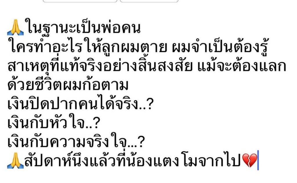 โดย “หนุ่ม ศรราม” ได้โพสต์ข้อความลงอินสตาแกรมส่วนตัวระบุว่า “ในฐานะเป็นพ่อคน ใครทำอะไรให้ลูกผมตาย ผมจำเป็นต้องรู้สาเหตุที่แท้จริงอย่างสิ้นสงสัย แม้จะต้องแลกด้วยชีวิตผมก็ตาม เงินปิดปากคนได้จริง…? เงินกับหัวใจ…? เงินกับความจริงใจ…? สัปดาห์นึงแล้วที่น้องแตงโมจากไป”