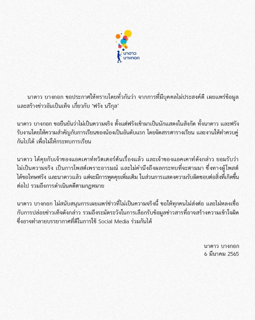 ล่าสุด นาดาว บางกอก ต้นสังกัด ของนักแสดงสาว ได้ประกาสผ่านอินสตาแกรม จ่อดำเนินคดีกับคนที่สร้างข่าวปลอม ทำให้เกิดความเสื่อเสียชื่อเสียง ยืนยันทางต้นสังกัด และ “ฟรัง นรีกุล” ได้รับงานโดยให้ความสำคัญกับการเรียนเป็นหลัก