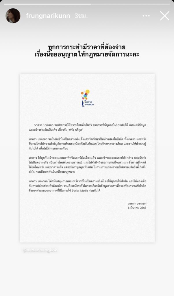 ขณะที่ “ฟรัง นรีกุล” ได้มีแชร์ประกาศของต้นสังกัดลงไอจีสตอรี่ พร้อมกับระบุว่า “ทุกการกระทำมีราคาที่ต้องจ่าย เรื่องนี้ขออนุญาตให้กฎหมายจัดการนะคะ ”