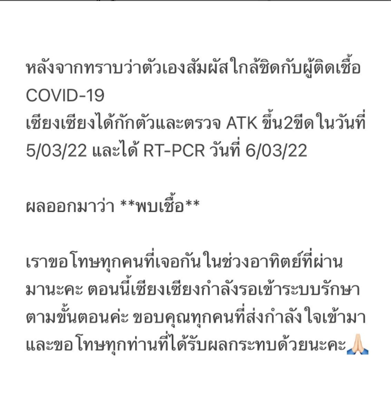 โดยสาวเซียงเซียง ได้โพสต์แจ้งข่าวประกาศว่าตนเองพบเชื้อโควิด-19 ผ่านอินสตาแกรม ว่า “หลังจากทราบว่าตัวเองสัมผัสใกล้ชิดกับผู้ติดเชื้อ covid-19 เซียงเซียงได้กักตัวและตรวจ ATK ขึ้น 2 ขีดในวันที่ 5/3/22 และได้ RT-PCR วันที่ 6/03/22 ผลออกมาว่า “พบเชื้อ”