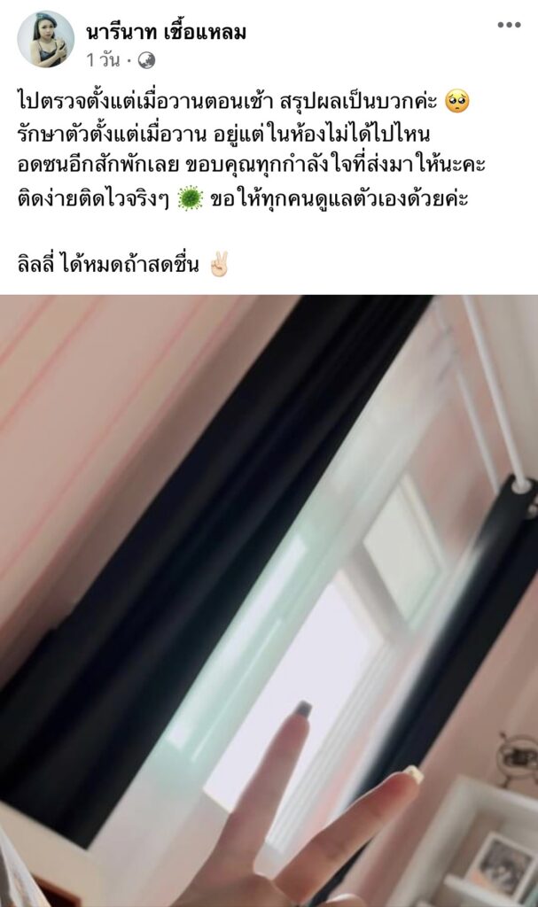 เป็นอีกหนึ่งคนที่ออกมาแจ้งผลตรวจยืนยันพบเชื้อโควิด-19 สำหรับนักร้องสาว “ลิลลี่ ได้หมดถ้าสดชื่น” น้องสาวของ “เจนนี่ ได้หมดถ้าสดชื่น” โดยก่อนหน้านี้เจ้าตัวได้มีการโพสต์เฟซบุ๊กแจ้งข่าวว่า ไปตรวจตั้งแต่เมื่อวานตอนเช้า สรุปผลเป็นบวกค่ะ 🥺 รักษาตัวตั้งแต่เมื่อวาน อยู่แต่ในห้องไม่ได้ไปไหน อดซนอีกสักพักเลย ขอบคุณทุกกำลังใจที่ส่งมาให้นะคะ ติดง่ายติดไวจริงๆ 🦠 ขอให้ทุกคนดูแลตัวเองด้วยค่ะ”