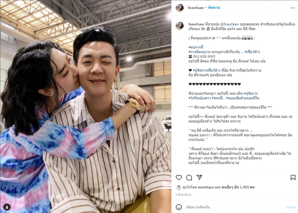 ล่าสุดเจ้าตัวได้เปิดตัวผู้จัดการคนใหม่เป็นที่เรียบร้อยแล้ว โดยได้โพสต์ภาพขณะหอมแก้มพี่ชายแท้ๆ ลงในอินสตาแกรมส่วนตัว พร้อมระบุข้อความว่า