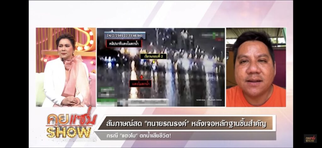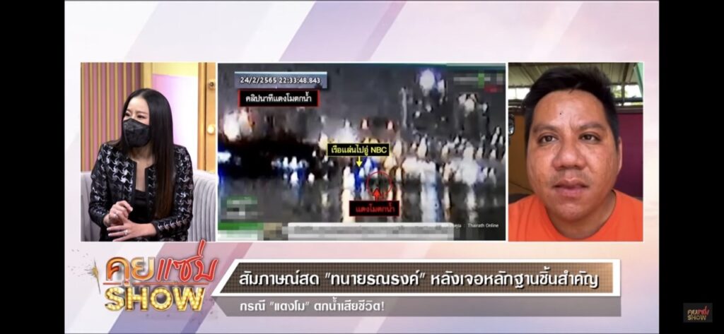 ระหว่างที่วัตถุตกลงน้ำแล้ววนกลับมาห่างกันประมาณกี่นาที?ทนายรณรงค์ : วนกลับมาอยู่ที่ประมาณเกือบๆ 1 นาที แต่ต้องเข้าในนะครับว่าตอนนั้นนำกำลังขึ้น-ลง พอคุณแตงโมหล่นมาในน้ำ คุณแตงโมก็ลอยไปตามน้ำด้วย คุณแตงโมไม่ได้อยู่จุดเดิมแต่ลอยไปตามน้ำ พอเรือวนกลับมาจุดเดิม คุณแตงโมเหมือนจะเลยเรือไปสักประมาณไม่ถึง 10 เมตร แต่ด้วยความที่ว่าตรงนั้นเป็นกลางคืนเลยไม่เข้าใจว่าทำให้มองไม่เห็นหรือเปล่าอาร์ต : สัณชาตญาณคนตมน้ำอยู่แล้วคือช่วยด้วยๆ เสียงมันต้องมี อย่างน้อยเสียงตีน้ำ เวลาคนล่องเรือที่เขาปิดไฟ เพราะเขาอยากเห็นผิวน้ำ เมื่อไหร่ที่เปิดไฟข้างนอกจะมืดหมดเลยพี่เอกคลิปนี้มันชัดจนจะมีผลดีต่อรูปคดีเลยไหม?ทนายรณรงค์ : เรากำลังหาอยู่ว่าแตงโมหล่นท่าไหน หล่นตำแหน่งไหนกันแน่ ซึ่งคลิปนี้มันจะอธิบายได้ว่าหล่นจากตำแหน่งท้ายเรือ แต่จะบอกว่าไปปัสสาวะไหม มันไม่เห็นขนาดนั้น เห็นว่าหล่นจากตำแหน่งท้ายเรือ แล้วพอเอาจิ๊กซอว์อื่นมาประกอบกัน เมื่อสัคครู่ที่บอกว่าทำไมถึงไม่เจอ ซึ่งภาพปรากฏว่าลงไปแล้วที่ขาได้รับบาดเจ็บอยู่ เป็นไปได้ว่าทำให้ไม่มีแรงตะโกนเรียกให้คนช่วยหรือเปล่า มันเป็นวิธีการคิดนะจังหวะที่ลงไป ไม่รู้ลงไปแบบไหน พอมันได้แผล แล้วระยะเวลากว่าเรือจะวนกลับมามันประมาณเกือบ 1 นาทีได้ หมดแรงก่อนหรือเปล่าที่จะตะโกนด้วยความเจ็บบุ๋ม : สิ่งที่เราอยากรู้คือการที่เราได้คลิปอันนี้มาเห็นความชัดเจนแล้วเนี่ย มันสามารถคำนวณหรือประเมินได้ใช่ไหมว่ามันคืออุบัติเหตุหรือไม่ใช่อุบัติเหตุ เพราะว่าถ้าเป็นอุบัติเหตุคดีอีกแบบนึง การฟ้องร้องจะเป็นอีกแบบนึง แต่ถ้าเป็นประมาทจนผู้อื่นถึงแก่ความตายมันก็จะเป็นอีกแบบนึง แต่ถ้าเป็นการกระชากเรือ โดยที่เรือก็มีบริเวณอยู่แค่นั้น ความรู้สึกของบุ๋มมันสามารถมองถึงการเล็งเห็นผลได้หรือไม่?ทนายรณรงค์ : ตอนนี้น้ำหนักมันไปที่อุบัติเหตุ อุบัติเหตุตัวนี้จะถามว่ามีคนประมาทไหม ความประมาททำให้เกิดอุบัติเหตุอยู่แล้วครับ แต่ใครประมาทเท่านั้นเอง ทีนี้พอมันหล่นลงไปแล้วผมไม่แน่ใจ มันมีทฤษฎีนึงแต่มันยังขัดหลักฐานที่จะมาเชื่อมโยงกันอยู่ ไม่รู่จะเล่าให้ฟังดีหรือเปล่าบุ๋ม : เล่าเถอะเปิดมาขนาดนี้แล้วทนายรณรงค์ : มันมีทฤษฎีนึง พอเราเห็นคลิป ด้วยความที่คนบนเรือรู้อยู่แล้วว่าแตงโมว่ายน้ำเก่ง พอหล่นไปแล้ววนกลับมาด้วยเวลาไม่ถึงนาที แล้วจุดนั้นเป็นจุดที่ไม่ถึง 10 เมตรมันน่าจะมองเห็นแตงโม พอมองเห็นเสร็จปุ๊บคิดว่าเพื่อนอำเล่นหรือเปล่าก็เลยไม่โยนชูชีพลงไปให้ คิดว่าเดี๋