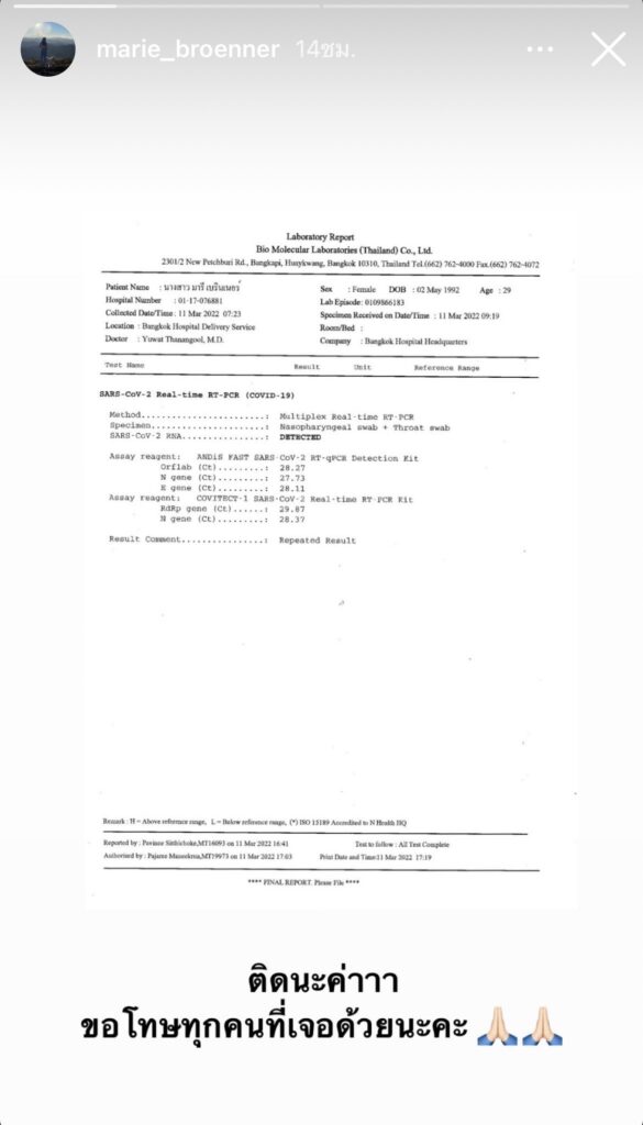สถานการณ์การแพร่ระบาดของโควิด-19 ยังคงลุกลาม และมียอดผู้ติดเชื้อเพิ่มสูงขึ้นในทุกวัน รวมถึงคนในวงการบันเทิงหลายคนทั้งดารา นักแสดง ศิลปิน ที่ต่างทยอยออกมาแจ้งติดเชื้อโควิด-19 และเข้ารับการรักษาตัวไปก่อนหน้านี้ เช่นเดียวกับนักแสดงสาว “มารี เบิร์นเนอร์” ที่ล่าสุดเจ้าตัวก็ไม่รอดในซีซั่นนี้ด้วยเช่นกัน เมื่อเจ้าตัวได้โพสต์ไอจีสตอรี่แจ้งข่าวโชว์ผลตรวจ RT-PCR เป็นบวก คือพบเชื้อโควิด-19 พร้อมกับบอกว่า “ติดนะคะ ขอโทษทุกคนที่ใกล้ชิดด้วยนะคะ”