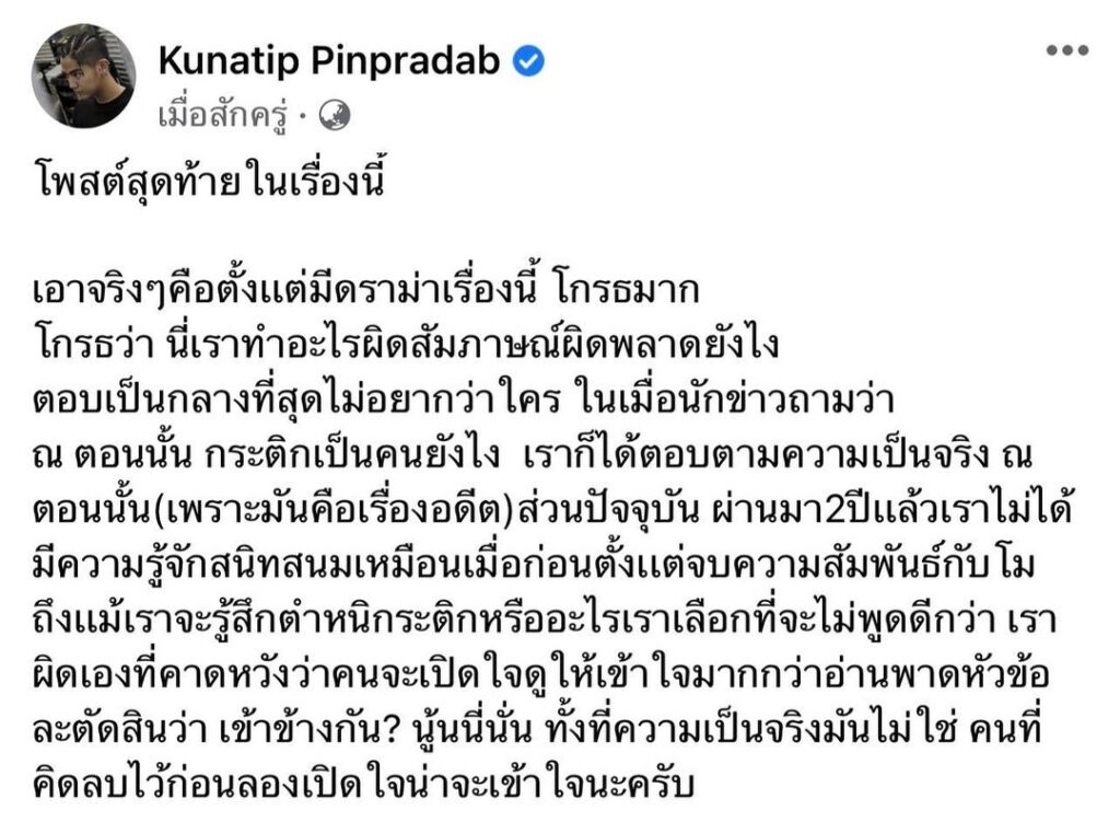 โดยเนื้อหาที่หนุ่ม “นิก” ได้โพสต์เอาไว้มีใจความว่า “โพสต์สุดท้ายในเรื่องนี้ เอาจริงๆคือตั้งแต่มีดราม่าเรื่องนี้ โกรธมาก โกรธว่า นี่เราทำอะไรผิดสัมภาษณ์ผิดพลาดยังไงตอบเป็นกลางที่สุดไม่อยากว่าใคร ในเมื่อนักข่าวถามว่า ณ ตอนนั้น กระติกเป็นคนยังไง เราก็ได้ตอบตามความเป็นจริง ณ ตอนนั้น (เพราะมันคือเรื่องอดีต)ส่วนปัจจุบัน ผ่านมา2ปีแล้วเราไม่ได้ มีความรู้จักสนิทสนมเหมือนเมื่อก่อนตั้งแต่จบความสัมพันธ์กับโม ถึงแม้เราจะรู้สึกตำหนิกระติกหรืออะไรเราเลือกที่จะไม่พูดดีกว่า เราผิดเองที่คาดหวังว่าคนจะเปิดใจดูให้เข้าใจมากกว่าอ่านพาดหัวข้อละตัดสินว่า เข้าข้างกัน? นู้นนี่นั่น ทั้งที่ความเป็นจริงมันไม่ใช่ คนที่คิดลบไว้ก่อนลองเปิดใจน่าจะเข้าใจนะครับ”