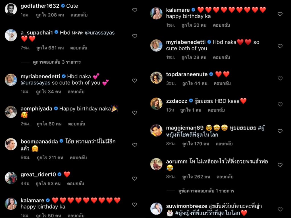 งานนี้อย่าว่าแต่แฟนๆเลยที่เขิน เพราะเพื่อนพี่น้องคนในวงการบันเทิงต่างพร้อมใจกันเข้ามาคอมเมนต์แซวสนั่นไอจี พร้อมกับร่วมอวยพรวันคล้ายวันเกิดให้กัย ญาญ่า กันอย่างอบอุ่น