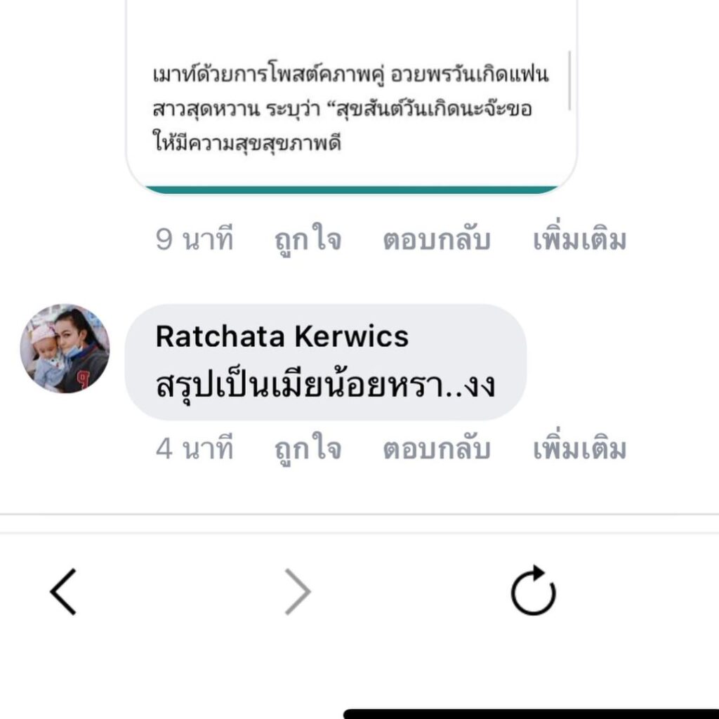 งานนี้เจ้าตัวแคปภาพเพจดังกล่าวพร้อมกับเขียนข้อความระบุเอาไว้ว่า “คิดอยู่นานเลยว่าจะจัดการกับสถานการณ์นี้ยังงัย พิมพ์อยู่วงการบันเทิงมามากกว่า 20 ปี ค่อนข้างรู้ว่าอะไรเป็นอะไร เราควรวางตัวแบบไหนเพื่อให้เป็นที่รัก และ เคารพ กับทุกๆฝ่าย แต่สื่อนี้ทำพิมพ์เดือดจริงๆค่ะ ไม่ทราบว่าใช้ข้อมูลจากไหนมาพาดหัวข่าวแบบนี้ ผิดตั้งแต่การใช้คำ ผิดที่ไม่ศึกษาหาข้อมูล ผิดที่ใช้ข้อความดูถูกผู้หญิงคนนึงที่ใช้ชีวิตแบบระมัดระวัง และมีสติมาตลอด ดูถูกกันด้วยข้อความชุ่ยๆแบบนี้ได้ยังงัย เลื่อนดูจะเห็นว่ามันสร้างข้อสงสัยให้คนที่อ่านว่า สรุปเป็น “เมียน้อย” ? มันไม่ใกล้เคียงด้วยซ้ำ
