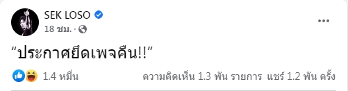 หลังจากนั้นไม่นาน เฟซบุ๊กของ เสก โลโซ ก็โพสต์อีกว่า “ประกาศยึดเพจคืน !!” งานนี้ก็มีชาวเน็ตแห่เข้ามาคอมเมนต์คิดถึงและยินดีต้อนรับการคัมแบ็กกลับมาของ เสก โลโซ กันอย่างมากมาย