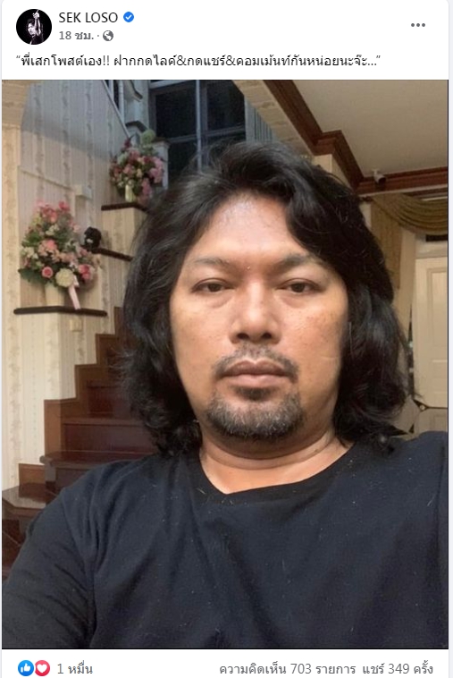 ล่าสุด แฟนคลับของเสก โลโซ ก็ได้เฮกันสนั่น เมื่อในเฟซบุ๊ก SEK LOSO ได้ลงภาพเซลฟี่ของพี่เสก พร้อมข้อความสั้น ๆ ว่า “พี่เสกโพสต์เอง !! ฝากกดไลก์ & กดแชร์ & คอมเมนต์กันหน่อยนะจ๊ะ…”