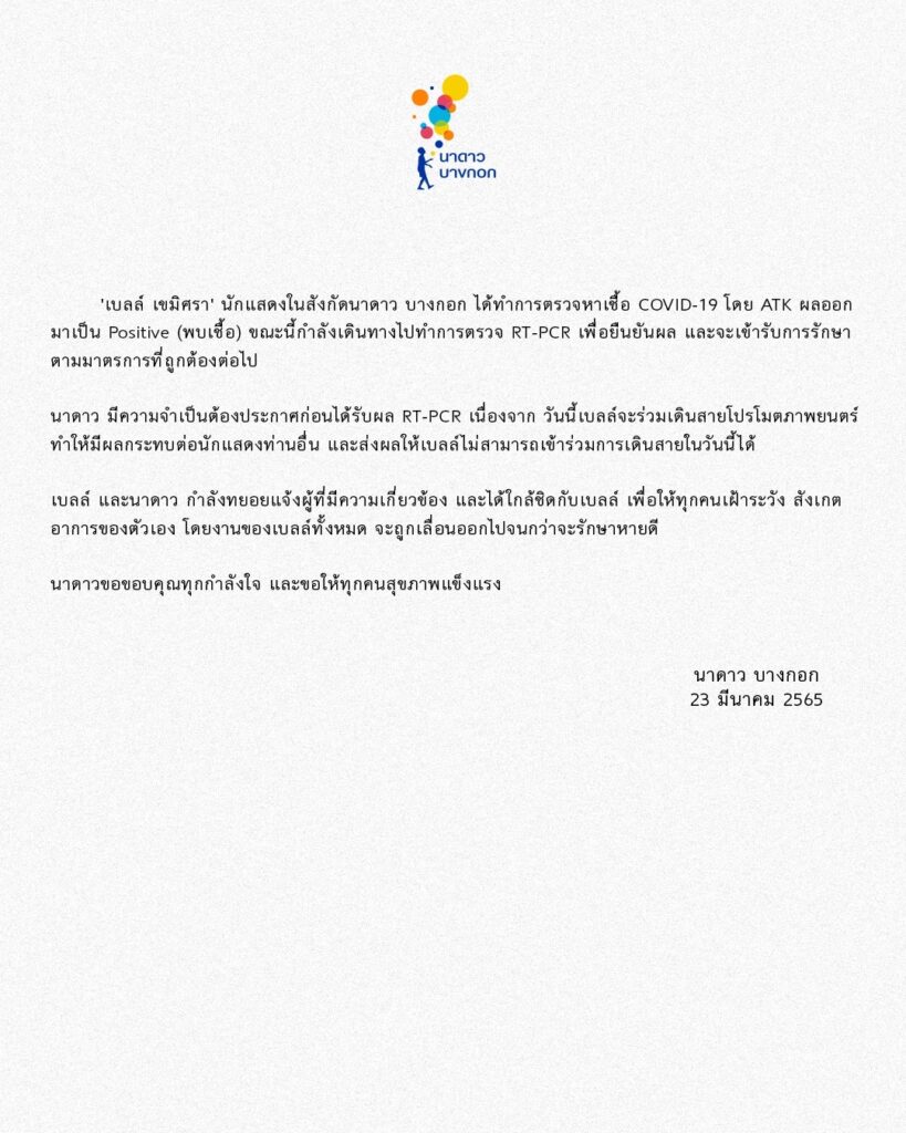 เป็นคนบันเทิงที่ติดเชื้อโควิด-19 อีกราย หลังจาก “นาดาว บางกอก“ ต้นสังกัดของนางแสดงสาว “เบลล์ เขมิศรา พลเดช” ได้ออกประกาศแจ้งข่าวว่าสาวเบลล์ได้ตรวจหาเชื้อโควิด-19 ด้วย ATK ผลขึ้น 2 ขีด เป็นบวก ซึ่งขณะนี้กำลังเดินทางไปตรวจหาเชื้อที่โรงพยาบาลด้วยวิธี RT-PCR อีกครั้ง และจะเข้ารักษาตามมาตรการที่ถูกต้องต่อไป