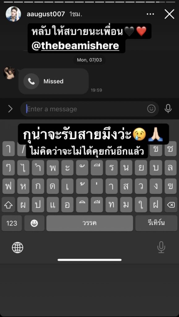 เช่นเดียวกับนักแสดงหนุ่ม ออกัส วชิรวิชญ์ หนึ่งในกลุ่มเพื่อนของ บีม ปภังกร ที่เจ้าตัวได้โพสต์ไอจีสตอรี่เปิดแชทข้อความที่ บีม โทรหาเมื่อ 7 มีนาคมที่ผ่านมาได้ไม่ได้รับ พร้อมกับบอกว่า “กูน่าจะรับสายมึงว่ะ ไม่คิดว่าจะไม่ได้คุยกันอีกแล้ว”