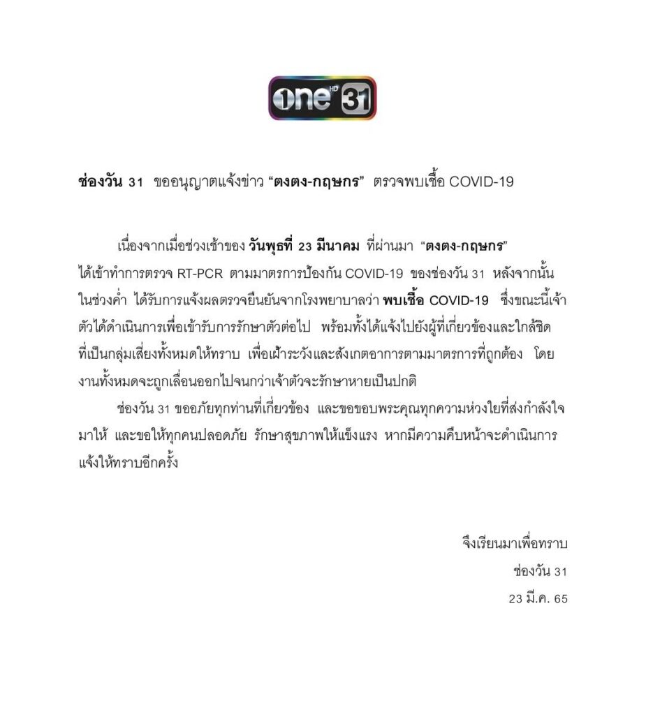ช่องวัน 31ขออภัยทุกท่านที่เกี่ยวข้องและขอขอบพระคุณทุกความห่วงใยที่ส่งกำลังใจมาให้  และขอให้ทุกคนปลอดภัย รักษาสุขภาพให้แข็งแรง  หากมีความคืบหน้าจะดำเนินการแจ้งให้ทราบอีกครั้ง”