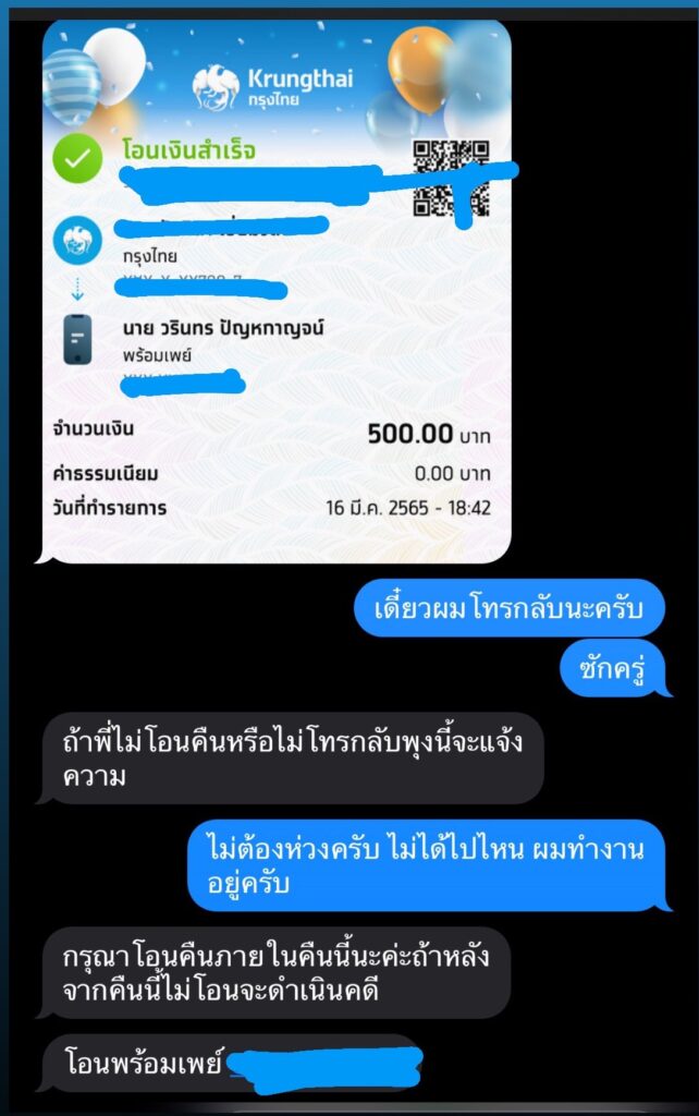 “ก่อนโอนคืนผมเช็กครับ ผมเห็นว่ามียอดเงินโอนเข้ามาจริง และเป็นชื่อเขาจริงๆ เนื่องจากผมได้ขอสลิปเขามาดูด้วย คือผมก็ไม่ได้คิดหรอกว่ามันจะมีอะไร เพราะผมก็โอนเงินคืนกลับเขาไป ตกใจไหมตอนที่เขาขู่ว่าจะแจ้งความ ไม่ตกใจ แต่ผมรู้สึกว่าแบบ ใจเย็นสิ บอกว่าทำงานอยู่ (หัวเราะ)”