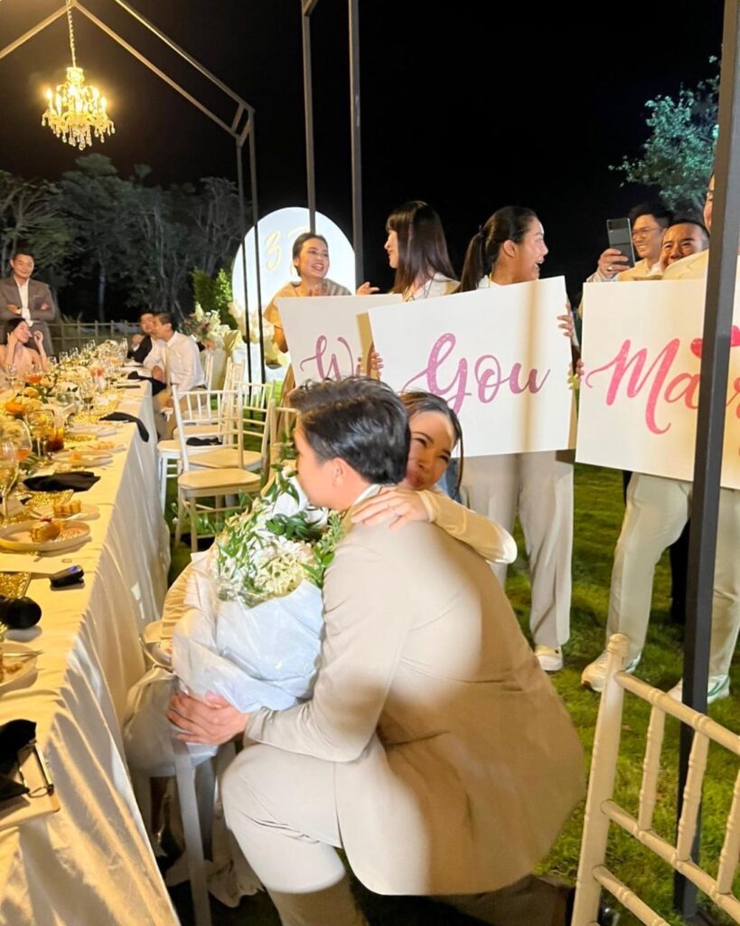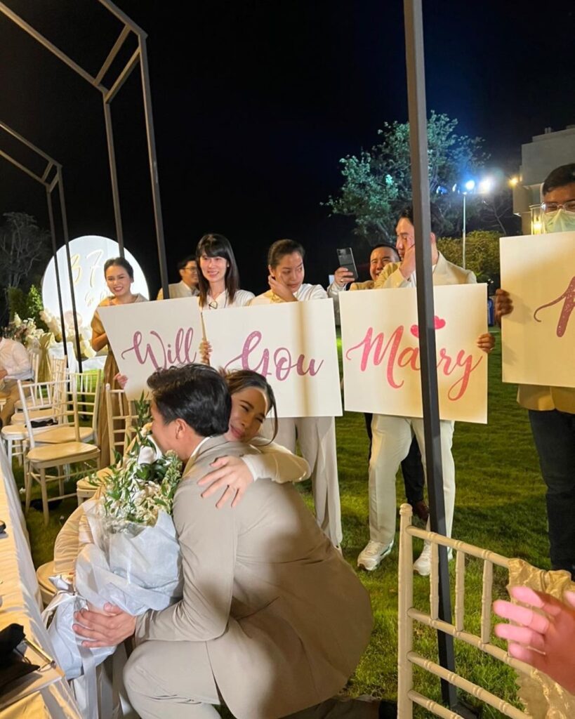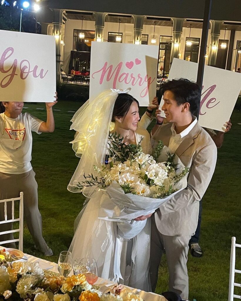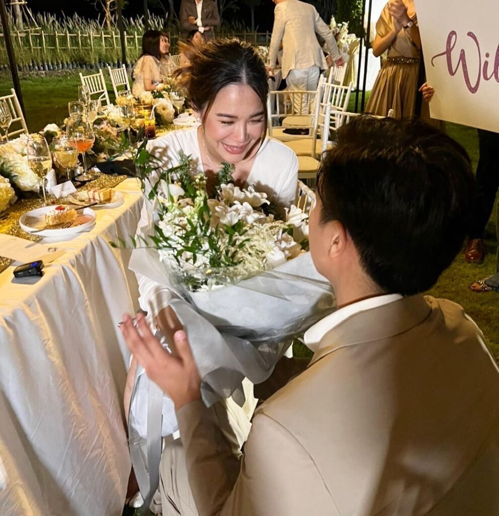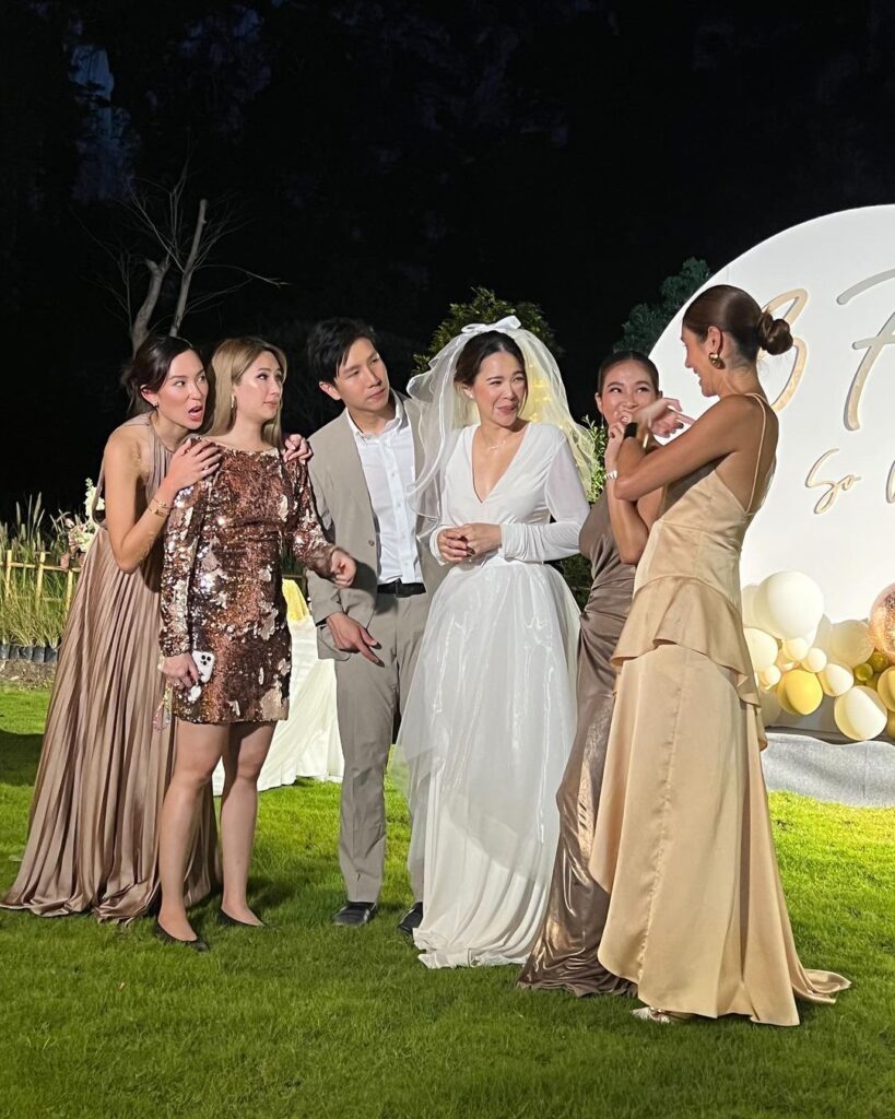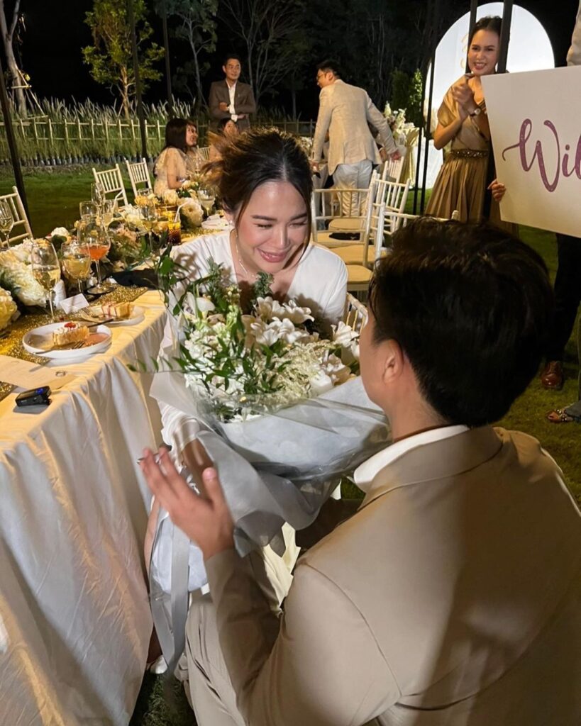 ซึ่งมีกลุ่มเพื่อนๆสนิทอย่าง มะลิ โคทส์, ปาย สิตางศุ์, เมย์ สิรินทร์, อั้ม ถิร ร่วมเป็นสักขีพยานและร่วมแสดงความยินดีกับทั้งคู่อย่างอบอุ่น รวมไปถึงเพื่อนพีน้องในวงการที่เข้ามาคอมเมนต์แสดงความยินดีกับว่าที่เจ้าสาวคนสวยด้วย