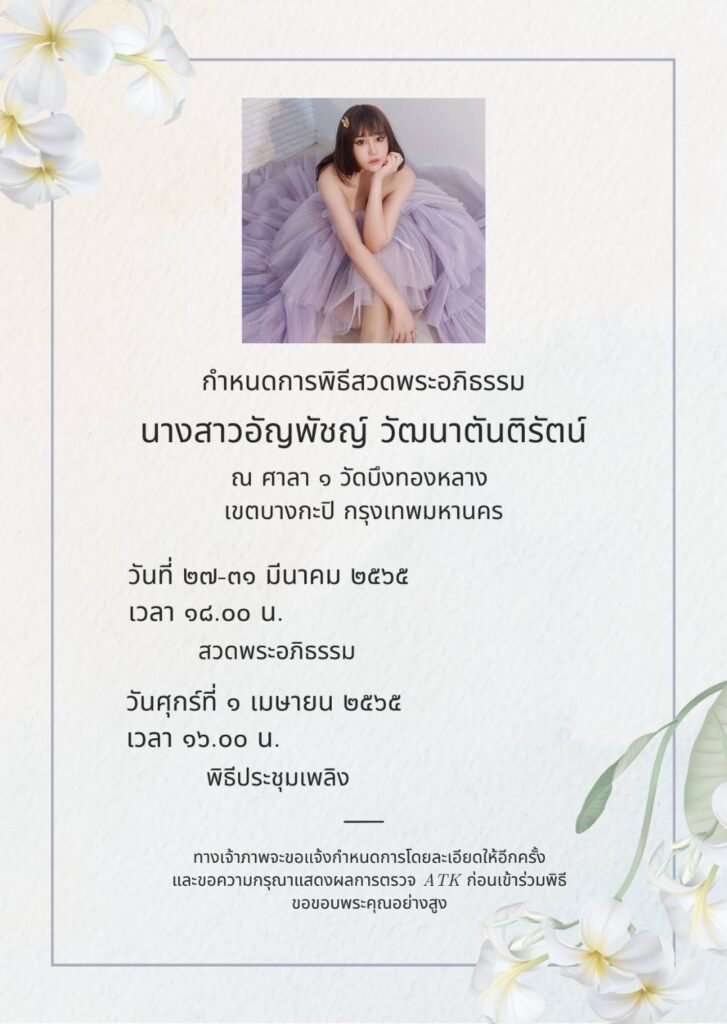 ซึ่งกำหนดงานพิธีศพของ “นุ๊กซี่” จะมีการสวดพระอภิธรรมศพในวันที่ 27-31 มีนาคม ณ ศาลา1 วัดบึงทองหลาง เขตบางกะปิ และมีพิธีประชุมเพลิงในวันที่ 1 เมษายน เวลา 16.00น.