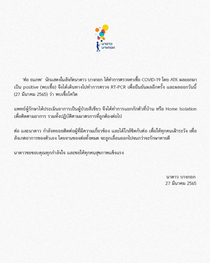 โดยแถลงการณ์ระบุว่า “ต่อ ธนภพ” นักแสดงในสังกัดนาดาว บางกอก ได้ทำการตรวจหาเชื้อ COVID-19 โดย ATK ผลออกมาเป็น positive (พบเชื้อ) จึงได้เดินทางไปทำการตรวจ RT-PCR เพื่อยืนยันผลอีกครั้ง และผลออกวันนี้ (27 มีนาคม 2565) ว่า พบเชื้อโควิด แพทย์ผู้รักษาได้ประเมินอาการเป็นผู้ป่วยสีเขียว จึงได้ทำการแยกกักตัวที่บ้าน หรือ Home Isolation เพื่อติดตามอาการ รวมทั้งปฏิบัติตามมาตรการที่ถูกต้องต่อไป