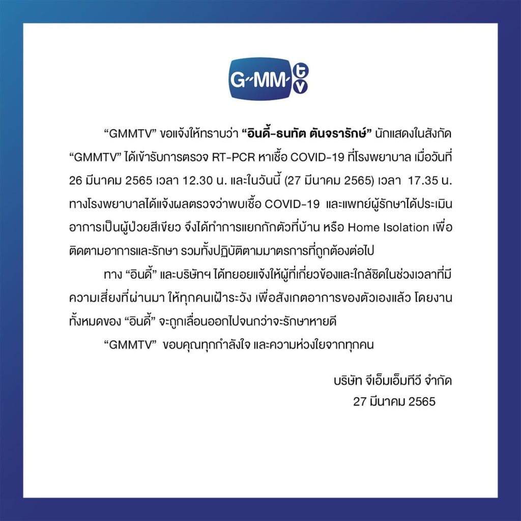 โดยระบุข้อความว่า “GMMTV” ขอแจ้งให้ทราบว่า “อินดี้ ธนทัต ตันจรารักษ์” นักแสดงในสังกัด “GMMTV” ได้เข้ารับการตรวจ RT-PCR หาเชื้อ COVID -19 ที่โรงพยาบาล เมื่อวันที่ 26 มีนาคม 2565 เวลา 12.30 น. และในวันนี้ (27 มีนาคม 2565) เวลา 17.35 น. ทางโรงพยาบาลได้แจ้งผลตรวจว่าพบเชื้อ COVID-19 และแพทย์ผู้รักษาได้ประเมินอาการเป็นผู้ป่วยสีเขียว จึงได้ทำการแยกกักตัวที่บ้าน หรือ Home Isolation เพื่อติดตามอาการและรักษา รวมทั้งปฏิบัติตามมาตรการที่ถูกต้องต่อไป