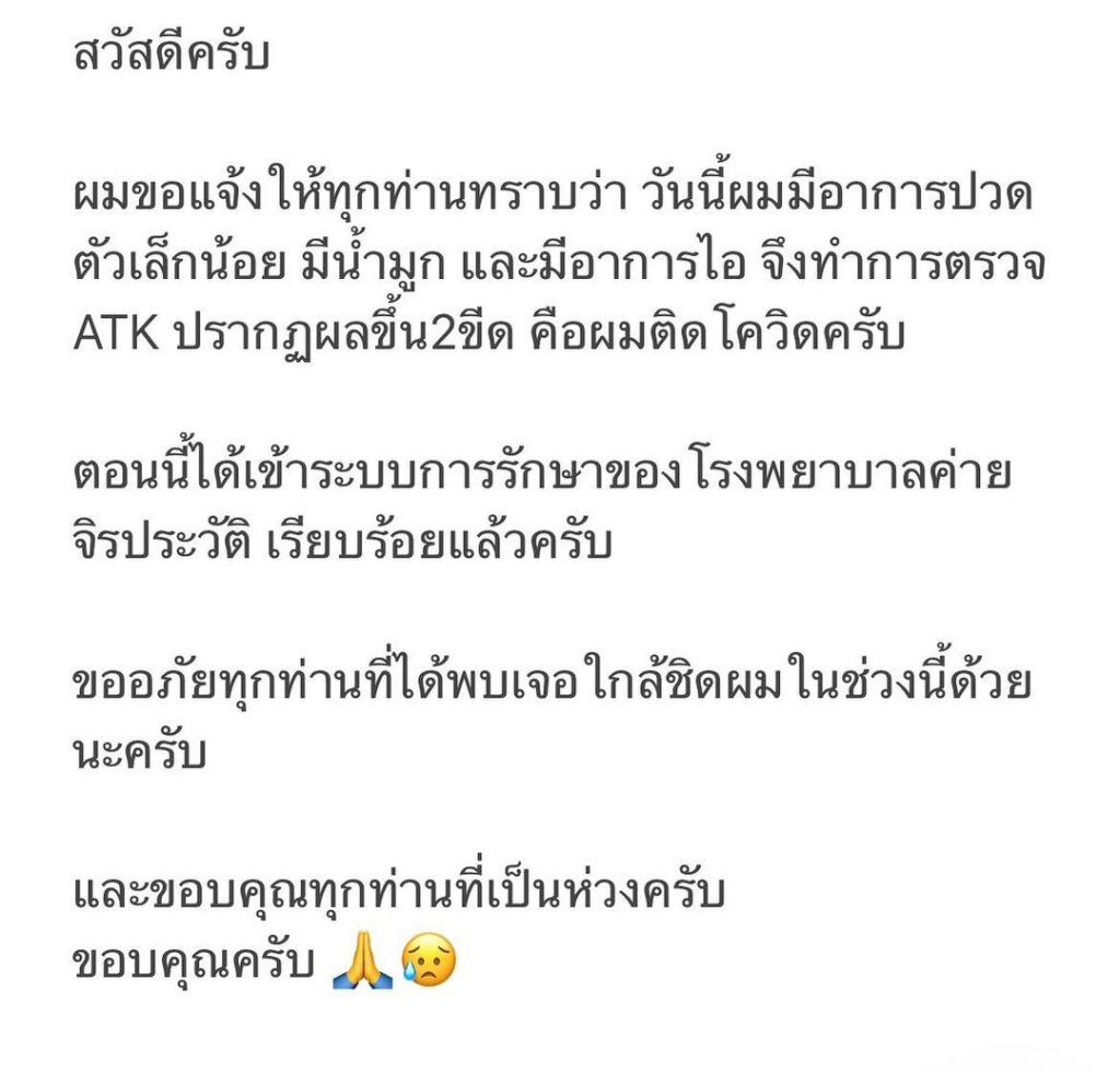 โดยมีข้อความระบุว่า “ผมขอแจ้งให้ทุกท่านทราบว่า วันนี้ผมมีอาการปวดตัวเล็กน้อย มีน้ำมูก และมีอาการไอ จึงทำการตรวจ ATK ปรากฎผลขึ้น 2 ขีด คือผมติดโควิดครับ ตอนนี้ได้เข้าระบบการรักษาของโรงพยาบาลเรียบร้อยแล้วครับ ขออภัยทุกท่านที่ได้พบเจอใกล้ชิดผมในช่วงนี้ด้วยนะครับ และขอบคุณทุกท่านที่เป็นห่วงครับ พร้อมแคปชั่นที่ระบุเอาไว้ว่า ดูแลตัวเองกันดี ๆ นะครับ สู้! ”