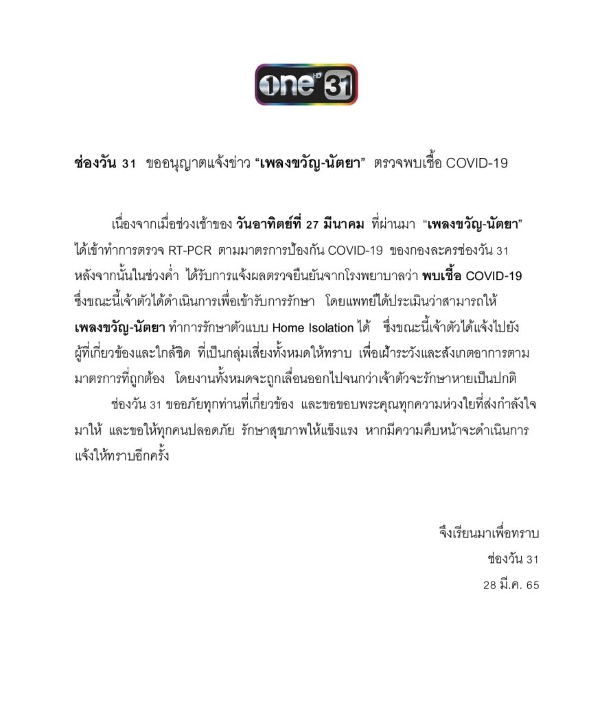 ช่องวัน 31 ออกประกาศแจ้งผลตรวจ “เพลงขวัญ นัตยา” พบเชื้อโควิด-19 โดยระบุว่า “เนื่องจากเมื่อช่วงเช้าของ วันอาทิตย์ที่ 27 มีนาคม ที่ผ่านมา “เพลงขวัญ-นัตยา” ได้เข้าทำการตรวจ RT-PCR ตามมาตรการป้องกัน COVID-19 ของกองละครช่องวัน 31 หลังจากนั้นในช่วงค่ำ ได้รับการแจ้งผลตรวจยืนยันจากโรงพยาบาลว่า พบเชื้อ COVID-19 ซึ่งขณะนี้เจ้าตัวได้ดำเนินการเพื่อเข้ารับการรักษาโดยแพทย์ได้ประเมินว่าสามารถให้ เพลงขวัญ-นัตยา ทำการรักษาตัวแบบ Home Isolationได้ ซึ่งขณะนี้เจ้าตัวได้แจ้งไปยังผู้ที่เกี่ยวข้องและใกล้ชิด ที่เป็นกลุ่มเสี่ยงทั้งหมดให้ทราบ เพื่อเฝ้าระวังและสังเกตอาการตามมาตรการที่ถูกต้อง โดยงานทั้งหมดจะถูกเลื่อนออกไปจนกว่าเจ้าตัวจะรักษาหายเป็นปกติ