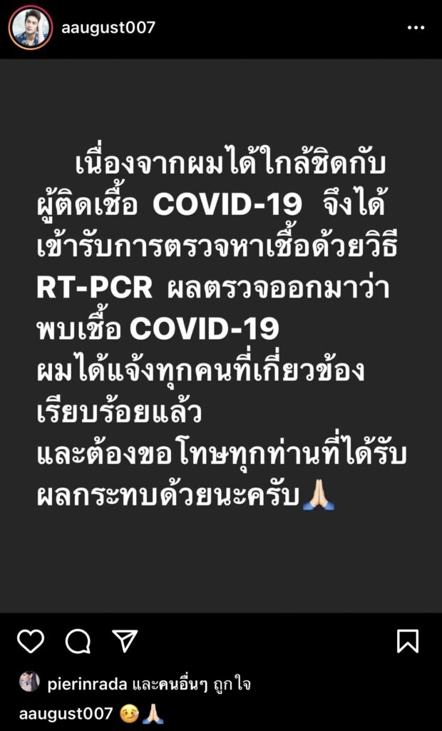 ล่าสุดนักแสดงหนุ่ม “ออกัส วชิรวิชญ์” ก็เป็นอีกหนึ่งคนที่ได้โพสต์ข้อความแจ้งข่าวกับแฟนๆหลังใกล้ชิดผู้ป่วยติดเชื้อโควิด-19 จึงได้ทำการตรวจแบบ RT-PCR ซึ่งผลออกมาว่าพบเชื้อ